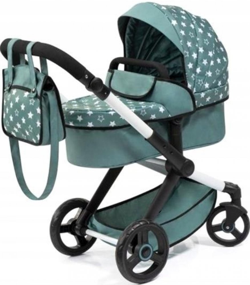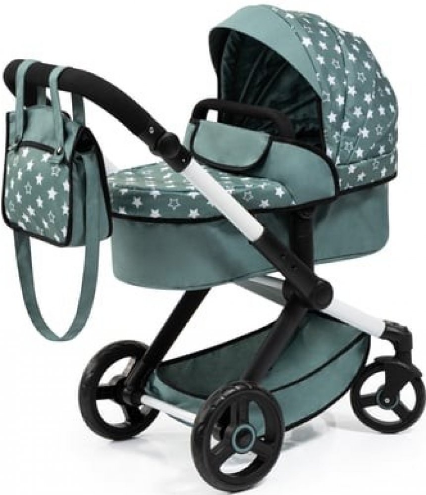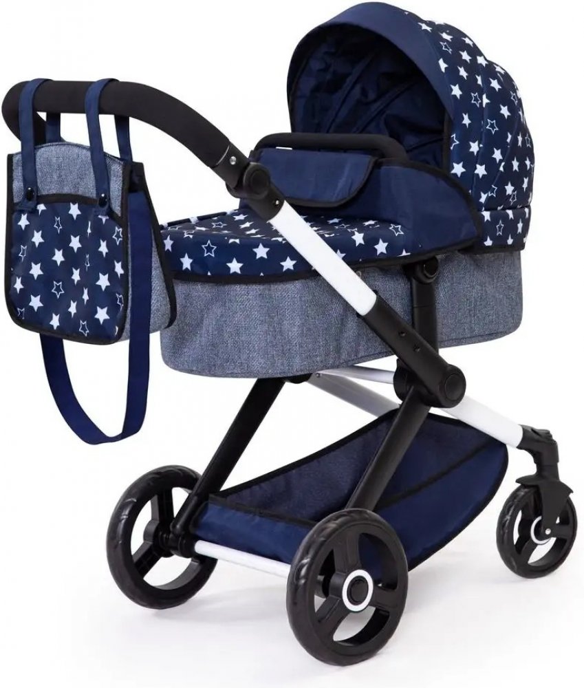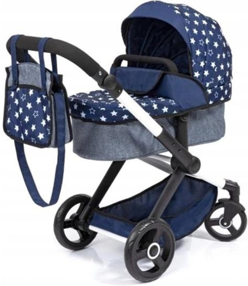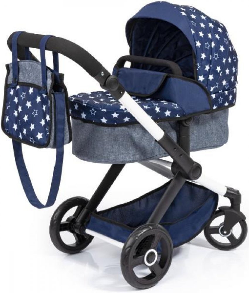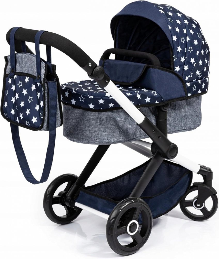 Kombinovaný kočárek pro panenky Xeo tmavě modré hvězdy Kombinovaný kočárek pro panenky Xeo má moderní design a zaujme mnoha možnostmi nastavení. Nabízí prostor pro panenky až do výšky 46 cm. Díky výškově nastavitelné rukojeti jej lze optimálně přizpůsobit výšce dítěte. Korbičku kočárku lze připevnit po směru i proti směru jízdy dítěte. Otočná tyč kočárku také umožňuje snadno měnit orientaci korbič...