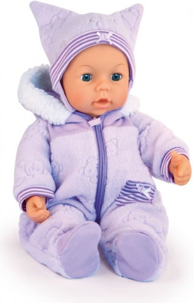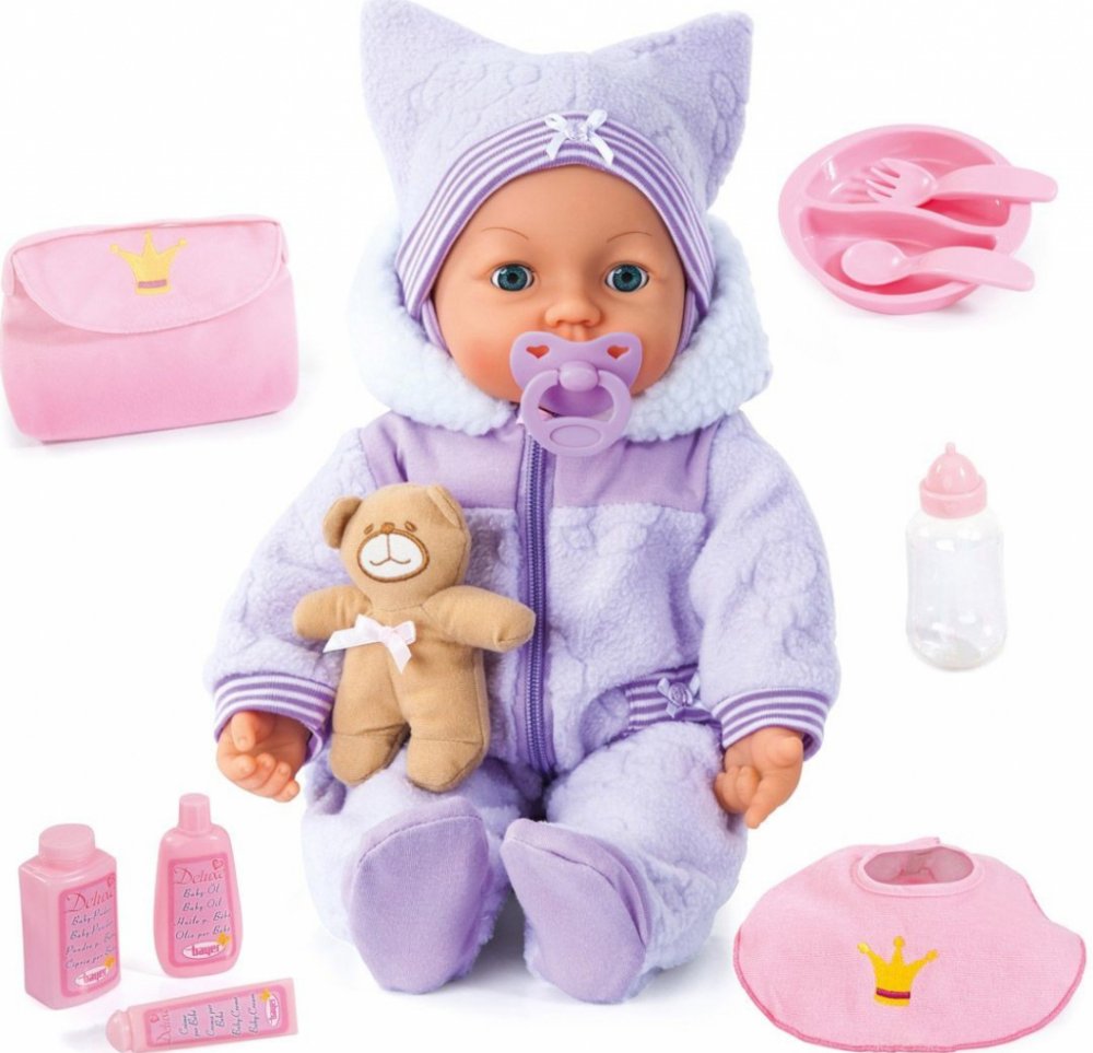 Krásná; 46 cm velká panenka Po zmáčknutí pravé ruky dělá různé zvuky dítěte; zavře oči a usne Polechtáním po nožičce se začne smát Pohlazením po bříšku; začnou její očka zářit a bude šťastná Krmením z láhve vydává zvuk pití a pohybuje ústy 3x AAA baterie nejsou součástí Vybavení Taštička Bryndáček Medvídek Plastové nádobí Lahvičky pro péči Dudlík Lahvička Doporučený věk Od 18 měsíců