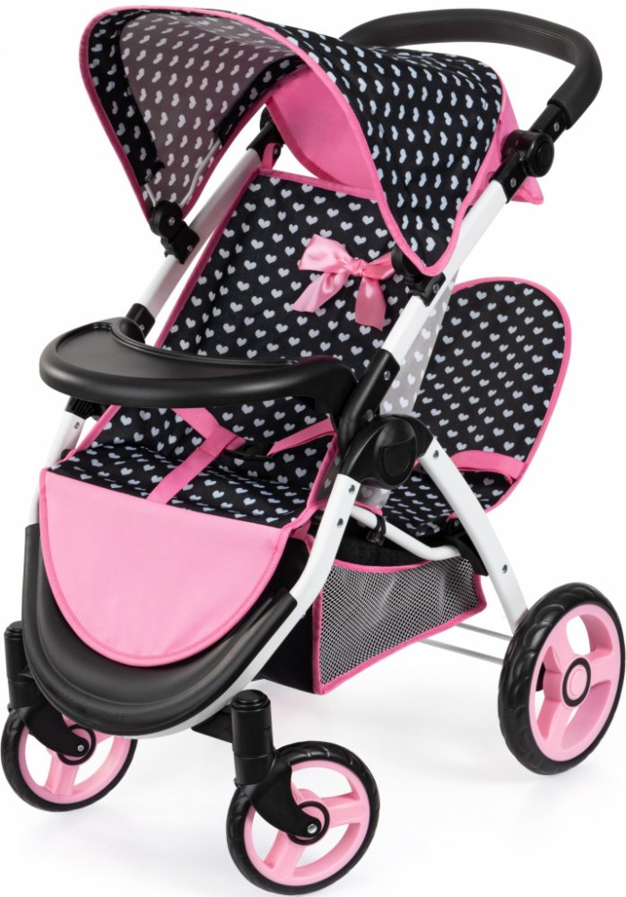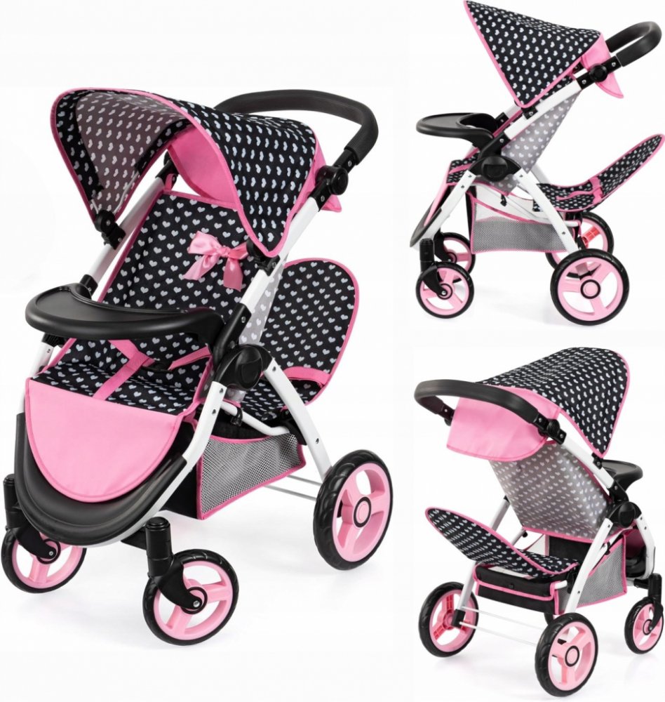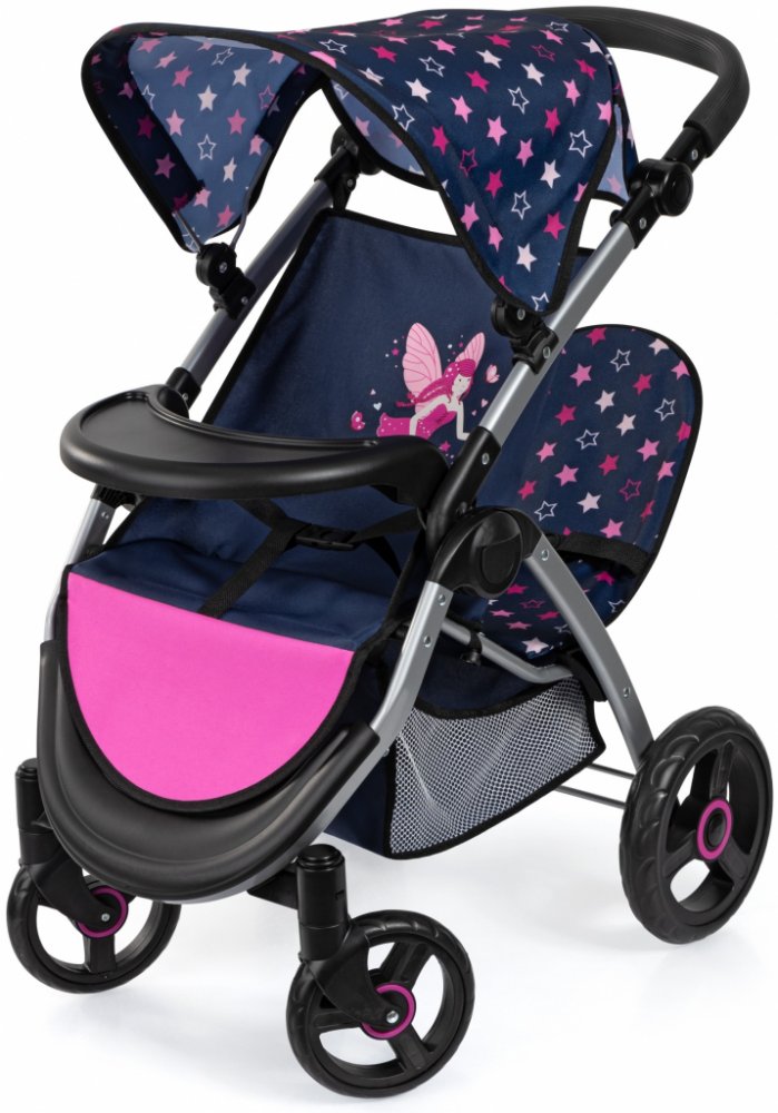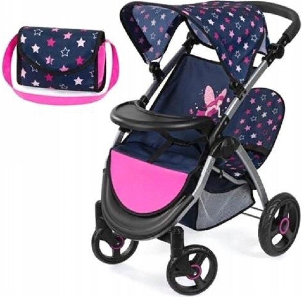 Tento moderní dvojitý kočárek pro panenky má moderní design a je vybaven taškou. Je určen pro panenky do výšky 46 cm. Sedadlo je vybaveno namontovanou podložkou, takže můžete panenku pohodlně krmit v kočárku. Kočárek pro dvojčata má navíc bezpečnostní pásy, díky kterým jsou panenky chráněny před vypadnutím. Díky nastavitelné rukojeti lze tento kočárek snadno přizpůsobit výšce dítěte. Otočná přední kola pomáhají snadno překonávat zatáčky. Tento kočárek lze složit a přepravovat, takže ušetříte místo při skladování. Integrovaný nákupní košík nabízí také místo pro všechny potřebné doplňky pro panenky. Taška na rámu v odpovídající barvě