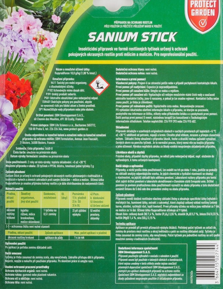 Sanium Stick od firmy Protect Garden jsou tyčinky s insekticidním a zároveň hnojícím přípravkem určeným k boji proti škůdcům jako jsou mšice a molice. Přípravek dále dodává množství živin a minerálů potřebných pro zdravý růst a rozvoj hnojených rostlin.