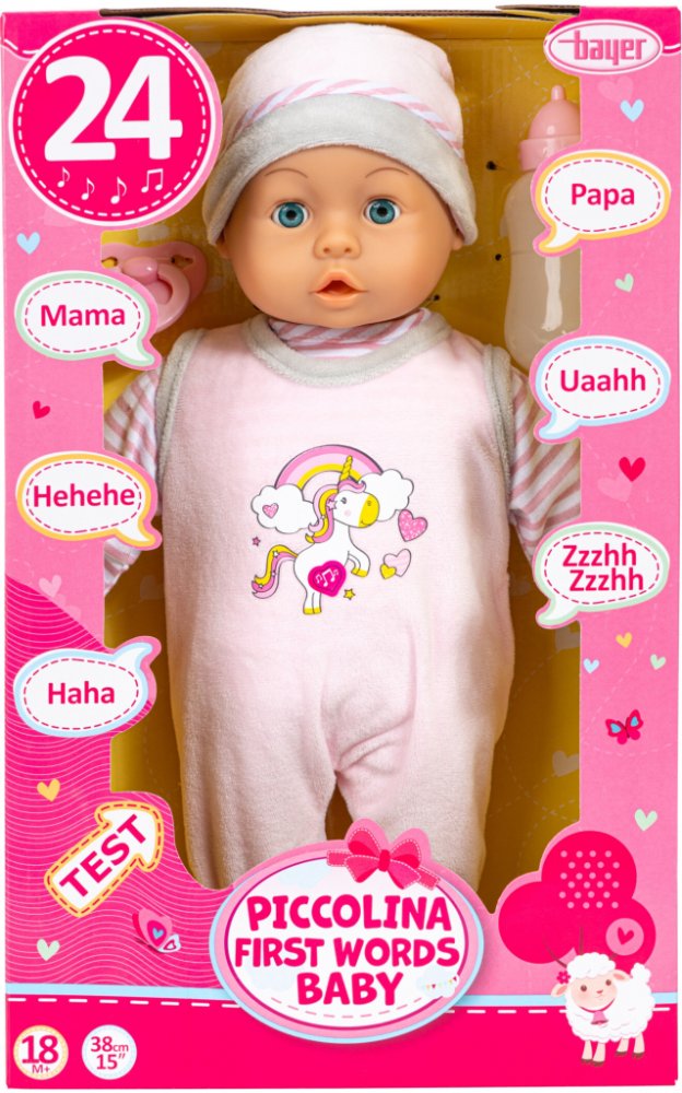 Bayer Panenka Piccolina First Words Baby Panenka s měkkým tělem vydává 24 různých zvuků Při stisknutí bříška se zasměje, pláče nebo dělá další zvuky Včetně dudlíku a lahvičky Včetně baterií Doporučený věk: pro děti od 10 měsíců Rozměry Výška: cca 38 cm Hmotnost cca 360 g
