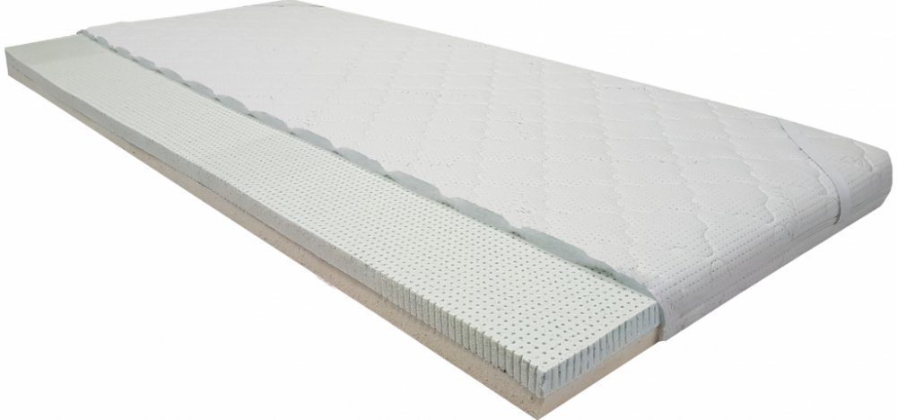 4 cm vysoká prodyšná vertikálně perforovaná latexová pěna Q-gel o objemové hmotnosti 65 kg/m3, s tuhosti H3 - tvrdší strana