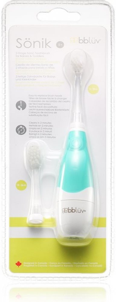 na AAA bateriidíky LED světlu se dítě bude bavit, zatímco mu budete čistit zubyzubní kartáček pulzuje každých 30 sekund a po dvou minutách se vypnejemné vibracebezpečné použití, dokonce i pro novorozenceobsahuje 2 hlavice (kojenec a batole)rozměry: průmer 2,8 cm, výška: 9,9 cm