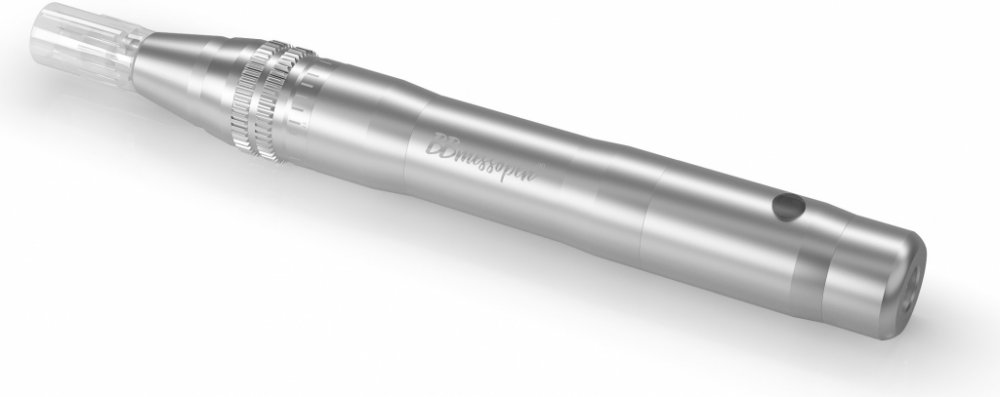 Pero je navrženo pro ošetření BBglow. Díky mikrojehličkování se do kůže dostane až o 80 % více složek, než při pouhém nanesení na její povrch. Do BBmessopera jsou vhodné pouze jednorázové sterilní hlavice s jehličkami s vnitřním závitem. Obsah balení: Kosmetický kufřík pro BBmessopen, tělo přístroje, výměnná baterie navíc, 2 ks náhradní hlavice 12 jehel, adaptér pro baterii, nastavení délky jehly: 0,25 mm – 2,5 mm, frekvence: 6 000 – 12 000 RPM (otáček), 5 rychlostí, které signalizují různé barvy. Doba provozu po nabíjení: od 2 do 4 hodin, baterie: 750 MAH, 4,2 V. Doba potřebná k nabití baterie: max 75 minut. Provoz BBmessopenu: Před prvním použitím pero nabijte. Úplné nabití pera signalizuje barevná kontrolka – změna z červené na modrou barvu. Vyjmněte jednorázový nástavec z obalu a připevněte ho do hlavice BBmessopenu. Zajistěte ho otočením nástavce. Ujistěte se, že je Electric microneedling pen nabité. Electric microneedling pen funguje v provozu bez připojení na adaptér – bezdrátově. BBmessopen spustíte dlouhým zmáčknutím čeného tlačítka. Opakovaným stiskáváním tlačítka regulujte otáčky a rychlost. Nastavení jehly – nástavce: Hlavice BBmessopenu disponuje ryskou a otočným mechanismem, který reguluje vysunutí jehel. Nastavit můžete vysunutí jehel na 0,25 mm až 25 mm. POZOR! Vysunutím jehel nad 1 mm riskujete hluboké trauma kůže zvláště v obličeji. Nečiňte tak, pokud k tomuto zákroku nemáte vážný důvod. (používá se v dermatologii) BBmessopen má certifikaci CE Prohlášení o shodě při nákupu jako profesionál (na IČO) na vyžádání zašleme na email. (není součástí balení) Jste-li profesionál a chcete nakupovat za velkoobchodní ceny, napiše nám na email eshopu. Manuál – návod na použití