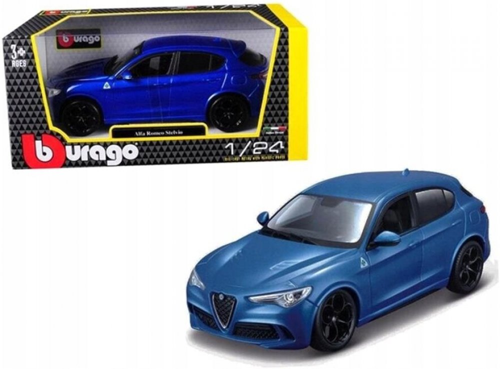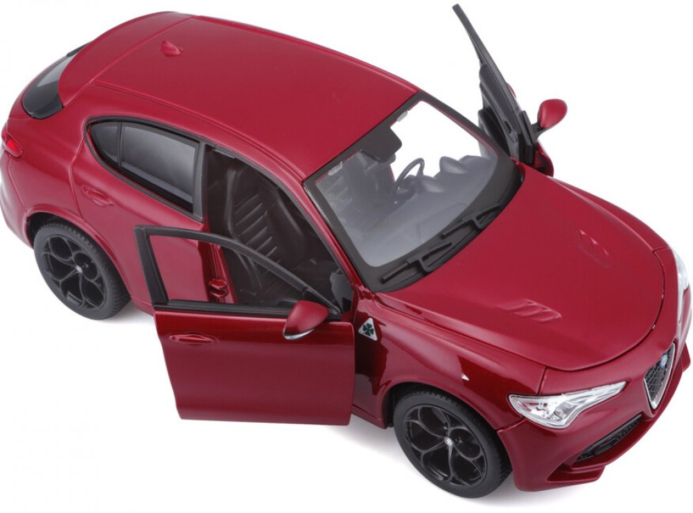 Kovový model auta 1:24 Bburago 18-21086 Alfa Romeo Stelvio, nejen pro sběratele. Má otevírací dveře a je v detailním provedení. Barva modelu je červená.