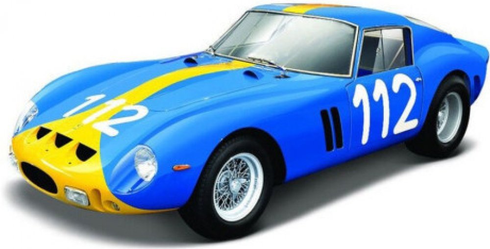 Kovový model auta Ferrari 250 GTO modré barvy v měřítku 1:24 značky Bburago. Karosérie modelu je vyrobena z kovu a obsahuje velké množství detailů. Model auta Ferrari 250 GTO má otvíratelné dveře.
