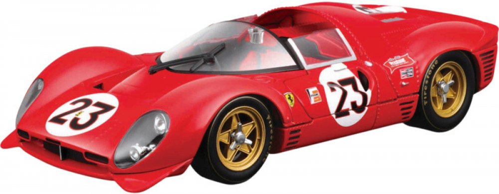 Model Bburag Ferrari 330 P4 Daytona 1967 1 : 24 Kit #23 v měřítku 1 : 24 představuje ikonický závodní vůz značky Ferrari s číslem 23, který se proslavil vítězstvím ve vytrvalostním závodě v Daytona v roce 1967. Karosérie modelu je zhotovena ze slitiny kovu v kombinaci s plastovými díly, povrch je upraven tampónovým tiskem pro věrné zachycení designu a detailů. Délka modelu činí přibližně 19 cm, což v měřítku 1 : 24 odpovídá proporcím originálu. Předlohou tohoto modelu je skutečný vůz Ferrari 330 P4 z roku 1967, který byl vybaven středem umístěným dvanáctiválcem V12 o objemu téměř 4 litry (3967 cm3) a výkonem kolem 450 koní. Motor umožňoval vozu dosáhnout maximální rychlosti přes 320 km/h. Konstrukce vozu zahrnovala rám z ocelových trubek, hliníkovou karosérii navrženou v aerodynamickém stylu a moderní závodní technologie pro svou dobu. Klíčové vlastnosti kovového modelu Ferrari 330 P4 Daytona 1967, 1 : 24, Kit #23, BburagoMěřítko 1 : 24Karosérie modelu je zhotovena ze slitiny...