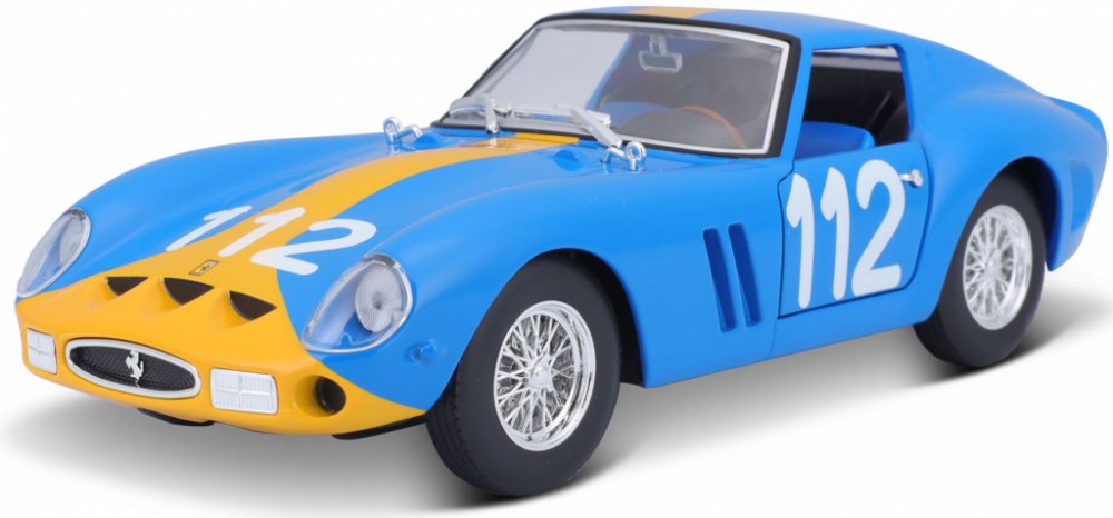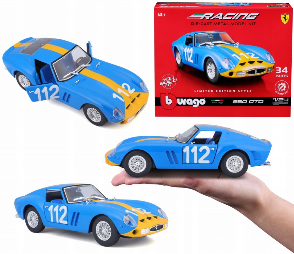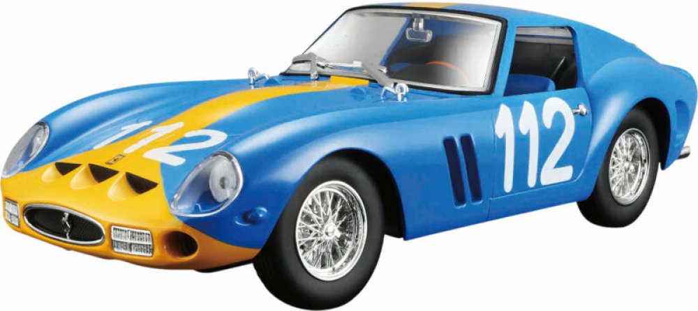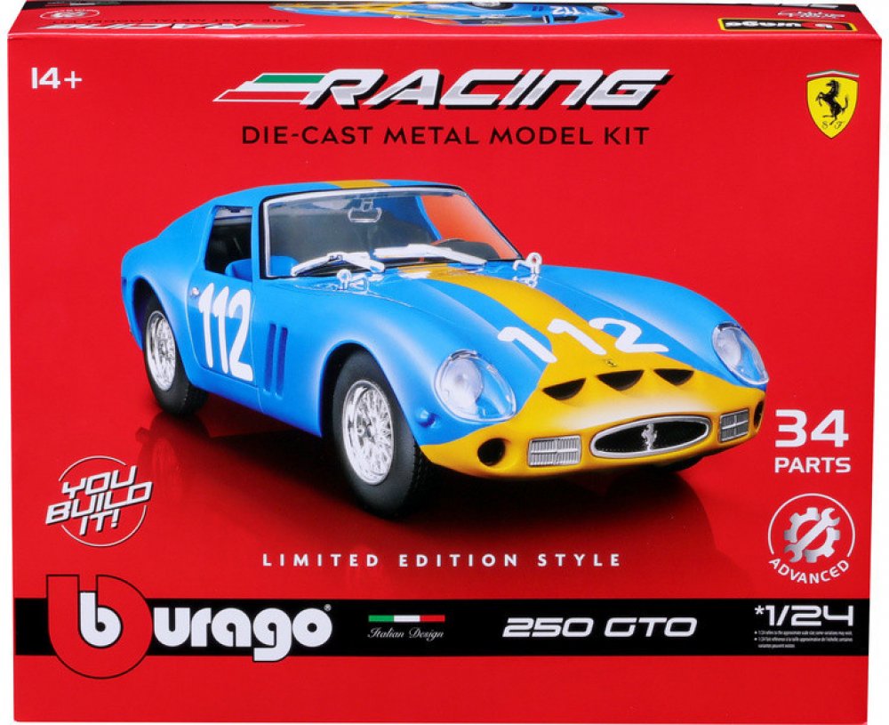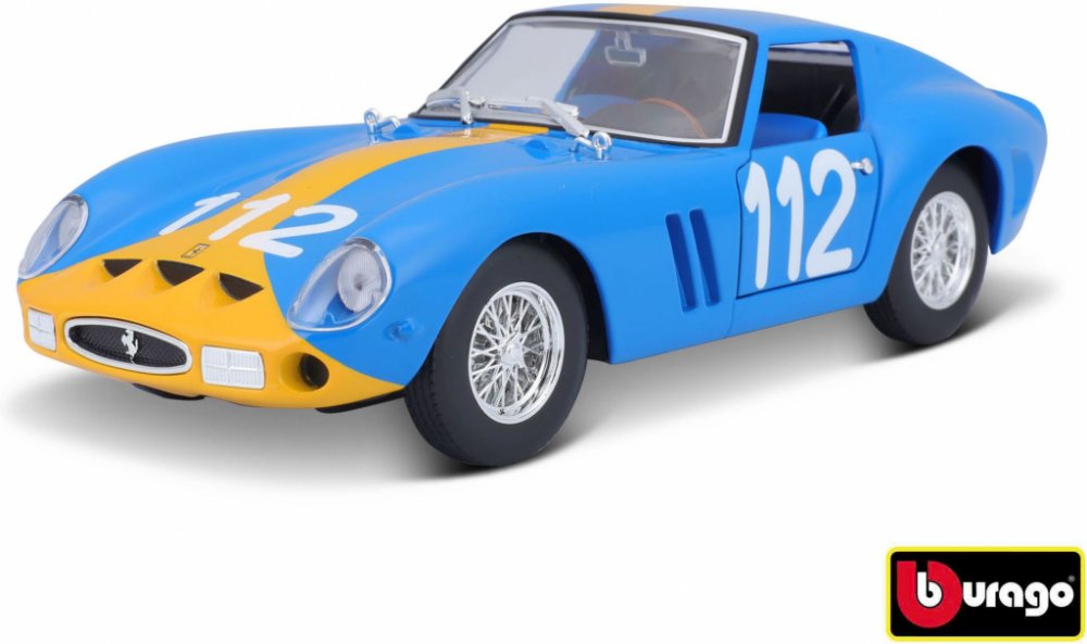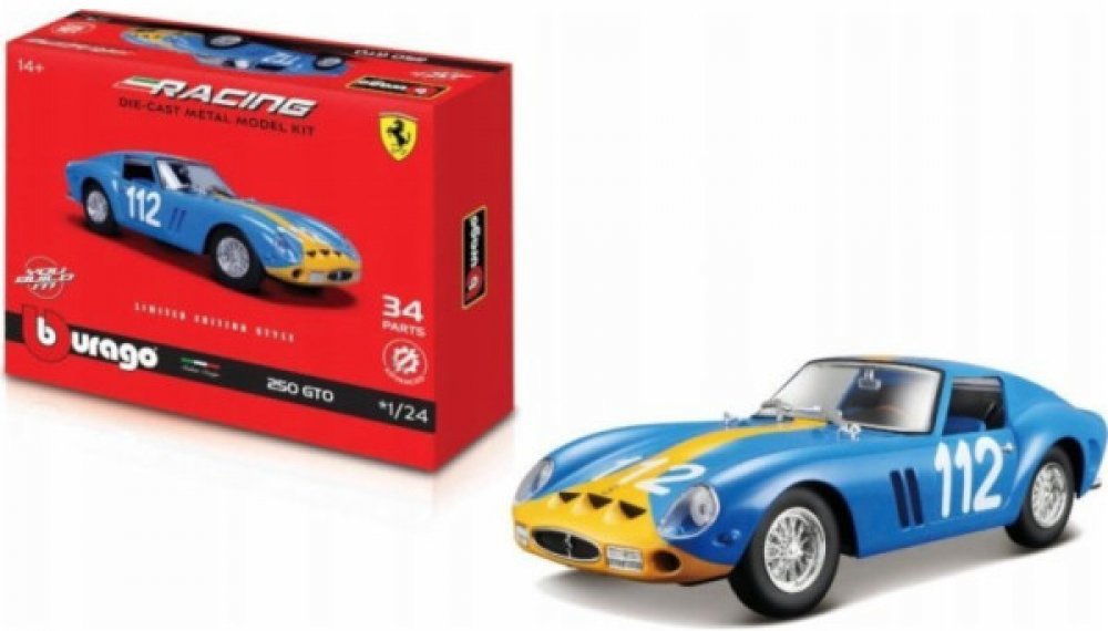CharakteristikaJste vášnivý sběratel kovových modelů aut? Nebo jen chcete udělat radost svému dítěti, přátelům nebo známým? Kovové modely autíček Bburago jsou pro tyto účely přímo dělané!Kovový model auta 1:24 Bburago 18-26581 Ferrari GTO 250 nejen pro sběratele. Model je ve špičkové kvalitě. Barva modelu je modrá a je přibližně 18 cm velký. V provedení KIT.Sběratelské modely aut Bburago patří mezi neoblíbenější na trhu, nejen díky pěknému zpracování, výběru typů aut, ale také přívětivé ceně. Karosérie modelů je vyrobena ze zinkohliníkové slitiny, která je kombinovaná s plastovými díly. Model obsahuje velké množství detailů interiéru, exteriéru, motoru a získá si Vás jedinečným provedením.Informace o předloze:Ferrari 250 GTO je grand tourer vyráběný automobilkou Ferrari v letech 1962 až 1964 pro homologaci v kategorii Grand Touring Group 3 FIA. Byl poháněn motorem Ferrari Tipo 168/62 Colombo V12. Písmeno „250“ v jeho názvu označuje zdvihový objem každého z válců v kubických centimetrech; „GTO“ znamená Gran Turismo Omologato, italsky „Grand Touring Homologated“.V letech 1962 až 1964 bylo vyrobeno pouze 36 vozů 250 GTO. Z toho 33 vozů s karoserií z let 1962-63 (série I) a tři vozy s karoserií z roku 1964 (série II) podobnou modelu Ferrari 250 LM. Čtyři ze starších vozů z let 1962-1963 (Series I) byly v roce 1964 modernizovány karoseriemi Series II.Jako nový stál 250 GTO ve Spojených státech 18 000 dolarů a kupce osobně schvaloval Enzo Ferrari a jeho dealer pro Severní Ameriku Luigi Chinetti. Od té doby se tento model stal velmi žádaným mezi automobilovými sběrateli a jeho prodeje opakovaně zaznamenaly cenové rekordy. Současný rekord nejdražšího Ferrari na světě byl stanoven v červnu 2018, kdy byl model 250 GTO z roku 1963 (podvozek 4153GT) prodán v soukromé aukci za 70 milionů dolarů.V roce 2004 zařadil časopis Sports Car International model 250 GTO na osmé místo v žebříčku nejlepších sportovních vozů 60. let a označil jej za nejlepší sportovní vůz všech dob. Podobně časopis Motor Trend Classic umístil model 250 GTO na první místo v seznamu „Nejlepších Ferrari všech dob“. Časopis Popular Mechanics jej označil za „Nejžhavější auto všech dob“.Řada modelů Bburago FerrariŘada Bburago Ferrari nabízí detailní provedení tamponového tisku, podrobně vytvořené vnitřní detaily modelu (např. přístrojová deska). Modely značky Ferrari jsou baleny v trdičním balení Bburago bez plastového podstavce.VlastnostiKarosérie je vyrobena ze zinkohliníkové slitiny.Karosérie je potištěna tampónovým tiskem kvalitní barvou.Velké množství detailů.Detailně zpracované světla a blinkry.Pryžové pneumatiky.