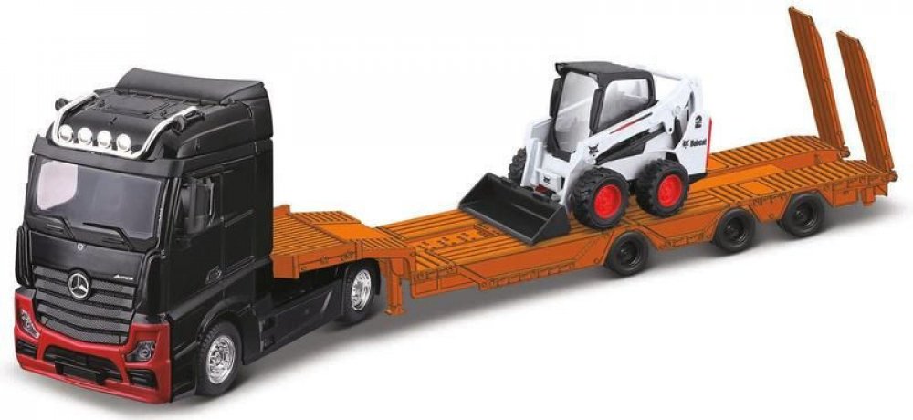 Bburago sada model tahače Mercedes-Benz Actros Gigaspace a nakladače Bobcat v měřítku 1:43. Detailní zpracování s důrazem na realistické prvky obou modelů.