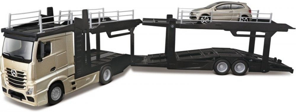 Kovový model Bburago 18-31458 - Mercedes-Benz Actros s VW Polo GTI Mark 5 v měřítku 1:43. Jsou vyrobeny z kovových a plastových dílů. Actros má patrové pohyblivé nákladové plochy, které se dají rozdělit na dvě části. Sestavený Actros je přibližně 47 cm velké, autíčko je přibližně 10 cm velké. Barva modelů je zlatá.