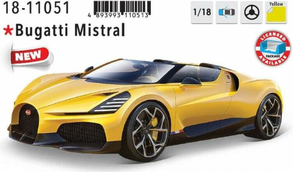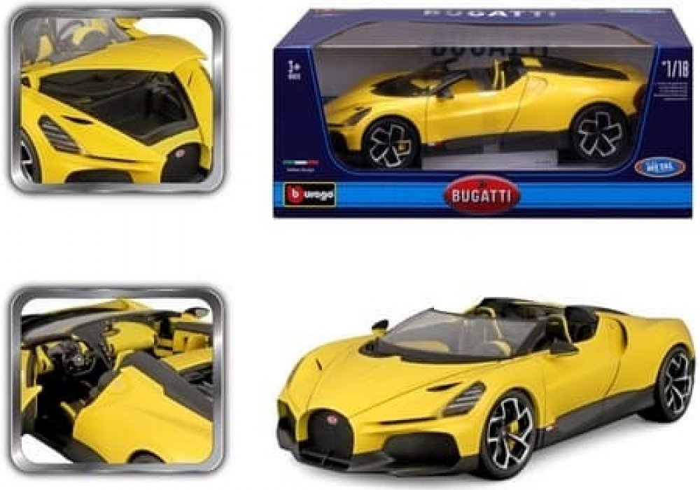 Kovový model Bburago Bugatti Mistral v měřítku 1:18 nejen pro sběratele. Detailní provedení, přívětivá cena, barva žlutá, délka přibližně 24 cm.