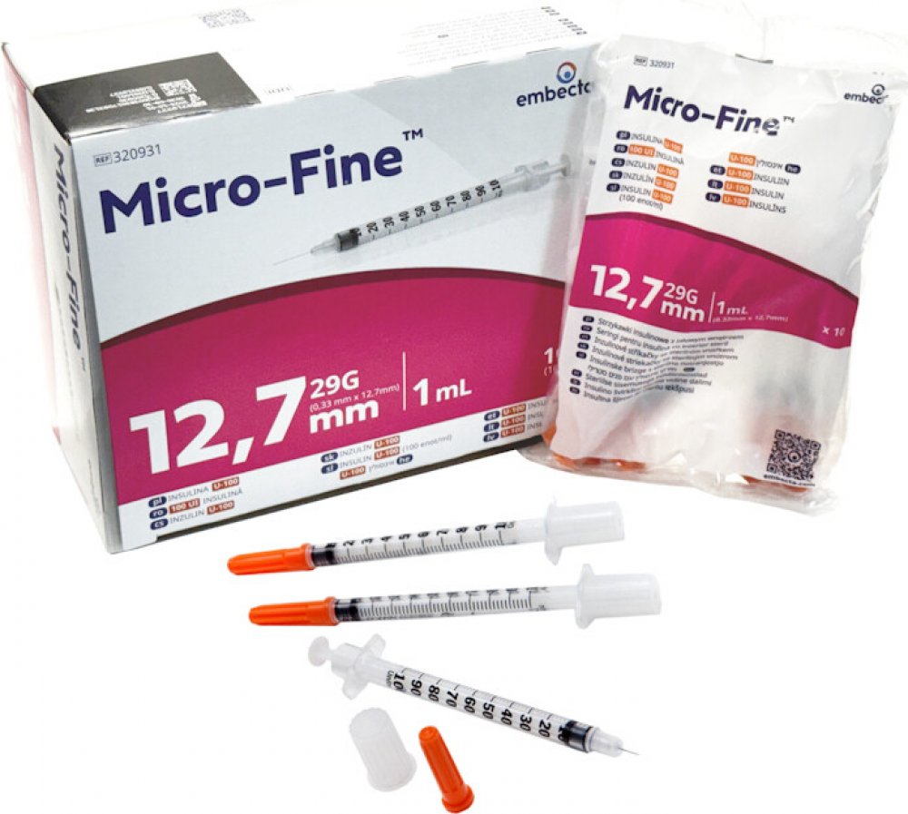 Jednorázová inzulínová stříkačka BD Micro Fine s integrovanou jehlou. Provedení: Inzulínová stříkačka 0,33 (29G) x 12,7 mm 1 ml U-100 Insulin Inzulínová stříkačka 0,30 (30G) x 8 mm 0,5 ml U-100 Insulin Cena za balení po 100 ks Důležité upozornění: Jedná se o zdravotnický prostředek. Před použitím si vždy pečlivě přečtěte informace o přípravku a je-li součástí tak i návod k použití