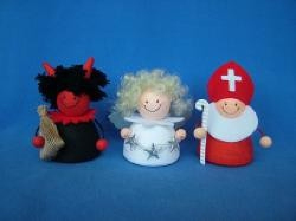 Do hlavy vlepíme špejli a hlavu přilepíme k tělu. Andělovi a Mikulášovi nakreslíme červené tváře. Válečky (nohy) přilepíme zespodu těla, umístíme je tak, aby figurka stála. Andělovi a čertovi nalepíme na hlavu vlasy, čertovi nalepíme přes vlasy rohy. Mikulášovi přilepíme vousy....