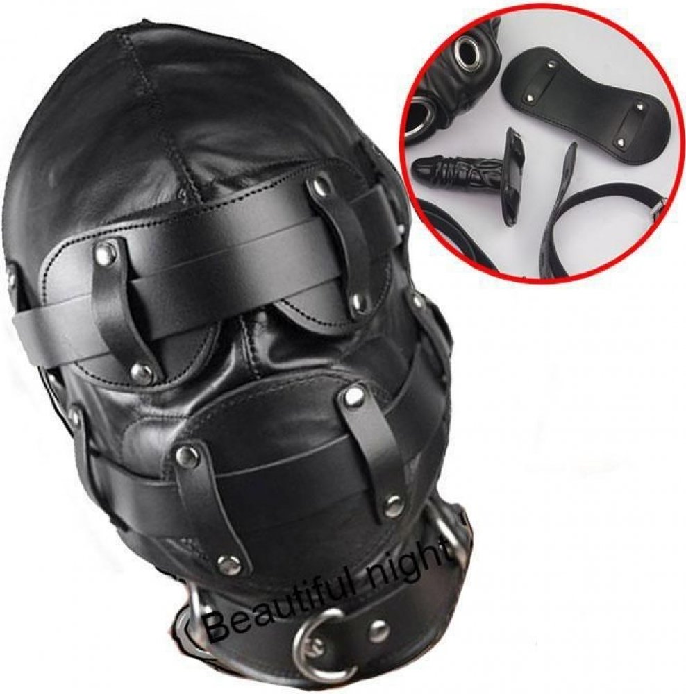 BDSM maska s odnímatelným dildem roubíkem a maskou přes oči velké otvory pro ústa a oči