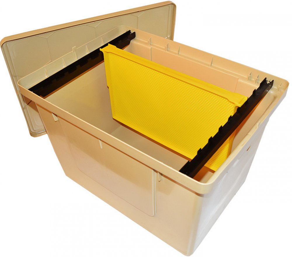 Plastová bedna je vhodná pro rámky 300 mm a nižší. Posunutím lišt můžeme přepravovat rámky, které se u nás používají a to šířky 370 mm, 390 ...