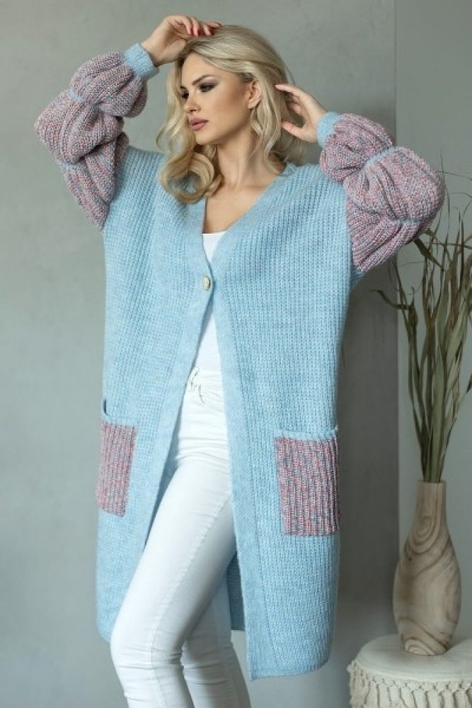 Dlouhé nabírané rukávy, volný dlouhý střih, měkký a nadýchaný kardigan, zapínání na knoflík.