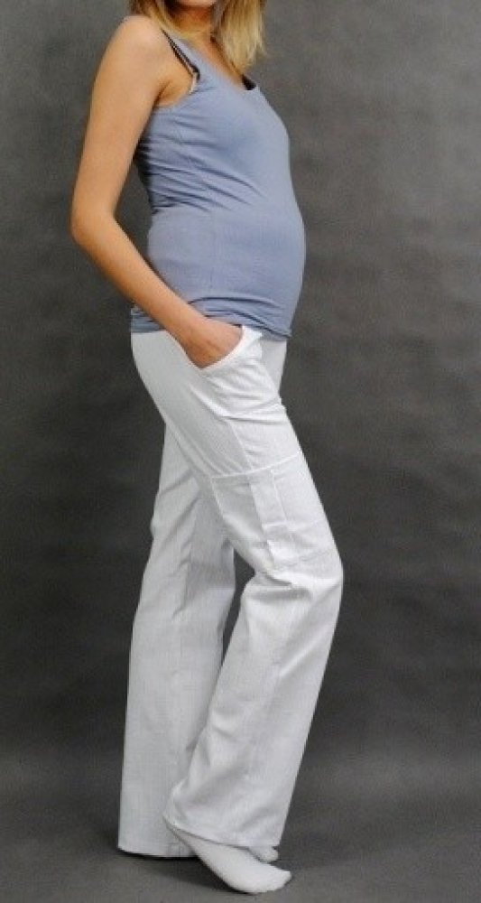 Kalhoty mají těhotenský pás, který se přizpůsobí rostoucímu bříšku.
