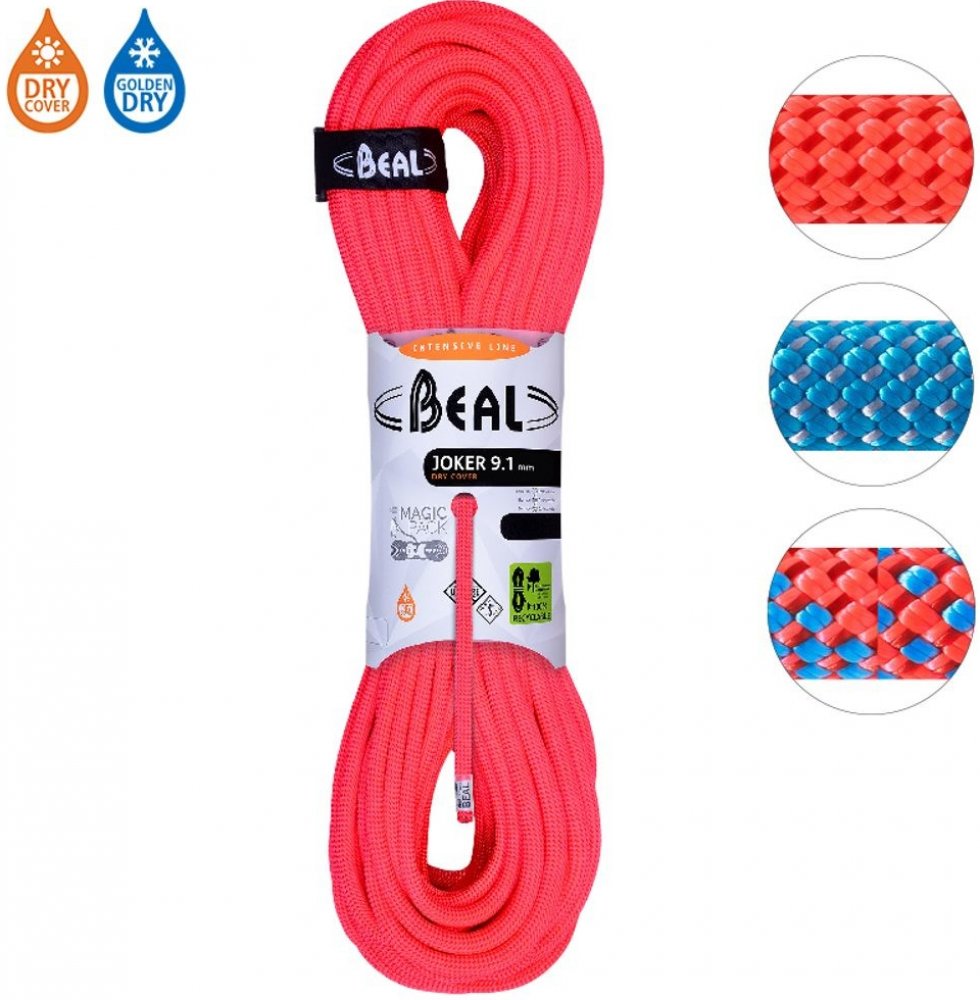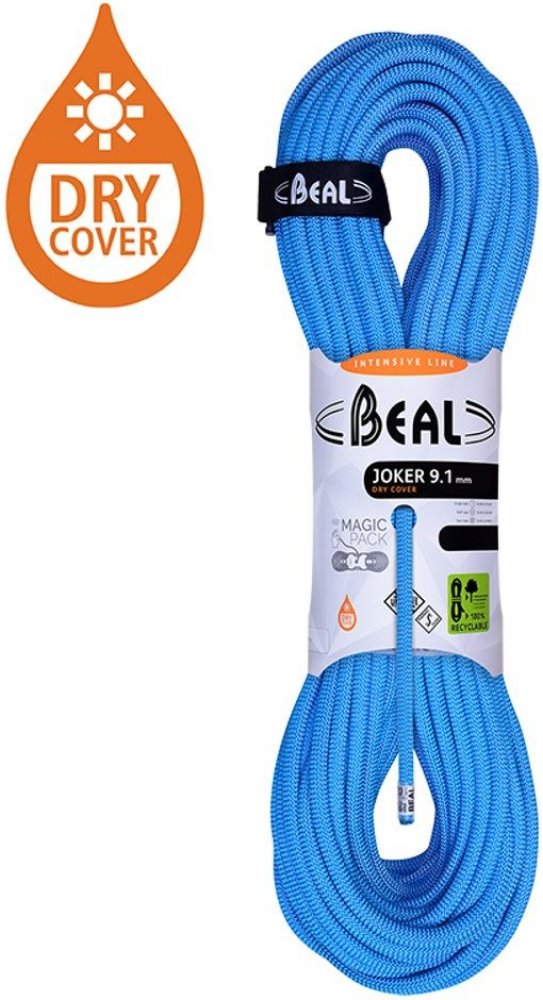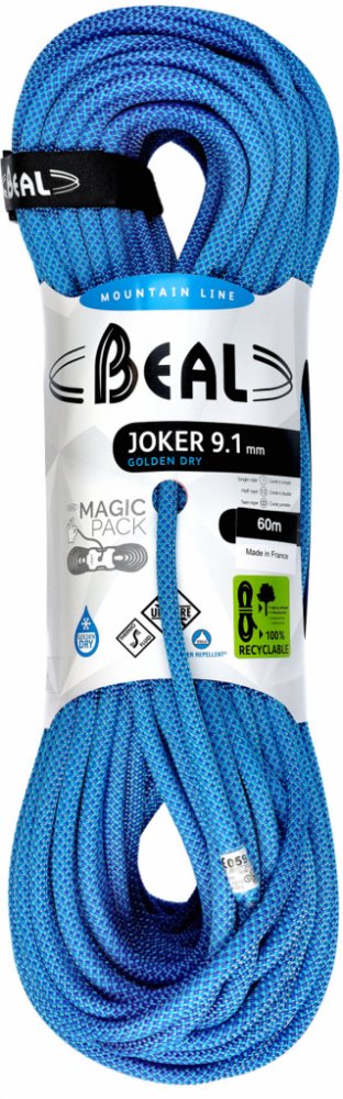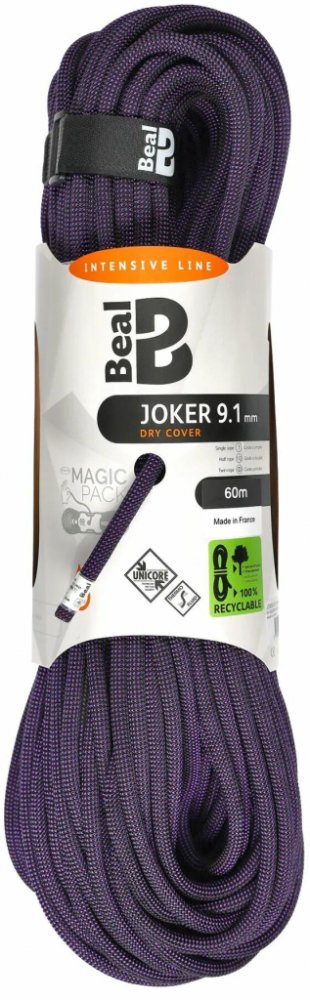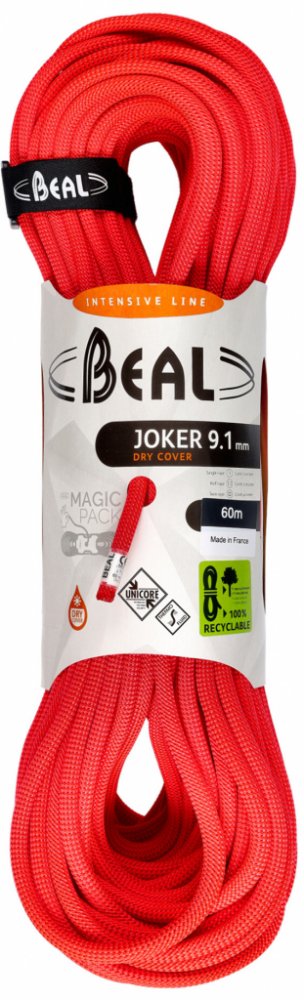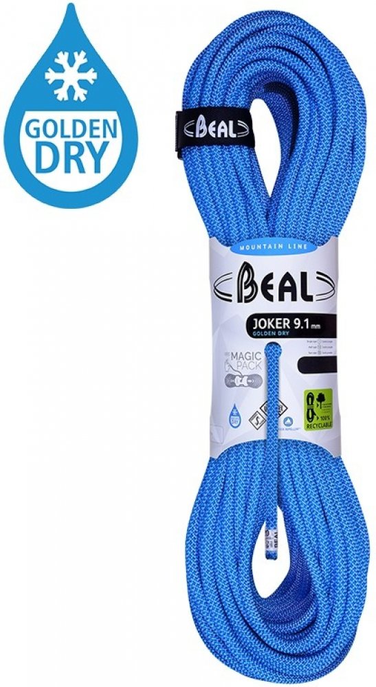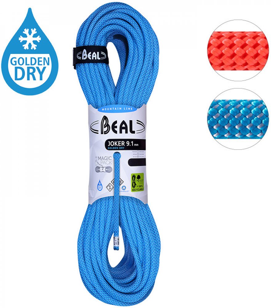 Víceúčelové ultralehké lano s impregnací Dry Coverje impregnace opletu lana, která výrazně zvyšuje jeho odolnost vůči oděru a pronikání vlhkosti či nečistot. Při výrobě lana je na každé vlákno opletové příze nanesen impregnační Při výrobě lana je na každé vlákno opletové příze nanesen impregnační roztok, následuje zahřátí, při kterém dochází k polymerizaci, a vzniká odolná vrstva chránící každé vlákno. Tato vlákna pak tvoří kompaktní oplet, který zvyšuje životnost lana. Testování v reálném prostředí ukázalo, že 100m lano bez impregnace, používané v zimních podmínkách, absorbuje v průběhu dne kolem 2,5 litru vody. Stejné lano s impregnací Dry Cover absorbuje ve shodných podmínkách pětkrát méně vody, tedy pouhých 0,5 litru. i Golden Dryje impregnace jádra i opletu lan BEAL Je to kombinací ošetření opletu Dry Cover a vodoodpudivé úpravy jednotlivých vláken jádra. Díky minimální absorpci vody se tak vyhnete problémům, jako je navýšení hmotnosti lana, či jeho mrznutí v zimních podmínkách. Povrchová úprava všech vláken přispívá k nižšímu tření uvnitř lana během namáhání, důsledkem čehož se výrazně prodlužuje jeho životnost. Testování v reálném prostředí ukázalo, že 100m lano bez impregnace, používané v zimních podmínkách, absorbuje v průběhu dne kolem 2,5 litru vody. Stejné lano s impregnací Golden Dry absorbuje ve shodných podmínkách desetkrát méně vody, tedy pouhých 0,25 litru. Impregnace Golden Dry splňuje i mezinárodní standard UIAA Water Repellent (nasákavost do 5%) s hodnotou nasákavosti do 2%.. o tloušťce 9,1mm bylo prvním na světě, které splnilo všechny tři normy pro dynamická lana. Je vhodné pro velmi zkušené lezce. Díky variantám impregnace je lano vhodné pro všechna venkovní použití, avšak díky své tloušťce je vhodné zejména pro velmi zkušené lezce. Joker 9,1mm se nabízí i s úpravou opletu Safe Control (impregnace DC). Všechny varianty Jokeru jsou vybaveny technologií Unicorepředstavuje jedinečný způsob spojení jádra a opletu lana bez ztráty poddajnosti, při zachování veškerých dynamických vlastností lana. Výsledkem je pak vyšší bezpečnost a životnost horolezeckých lan BEAL. JAK FUNGUJE UNICORE®? Oplet lana může být přeseknutý nebo prodřený, ale stále zůstává pevně spojen s jádrem, což umožňuje lezci bezpečně slanit či stoupat. Když dojde k přeseknutí opletu přes hranu u běžného lana, což je častý případ v horách, oplet se shrne a jádro se odkryje v rozsahu až několika metrů. Pak není možné přes tento úsek lana stoupat či slaňovat. Lano s takto poničeným opletem lze využít maximálně pro nouzový únik, na další lezení už ale určitě není bezpečné. Technologie UNICORE® zcela zabraňuje posuvu opletu a je výjimečně užitečná při alpském lezení v mokrém sněhu a ledu, kde se riziko posuvu opletu značně zvyšuje., která díky spojení jádra a opletu zvyšuje bezpečnost i životnost lana.