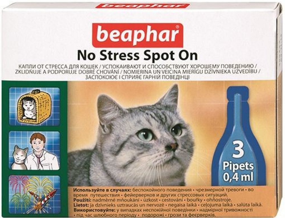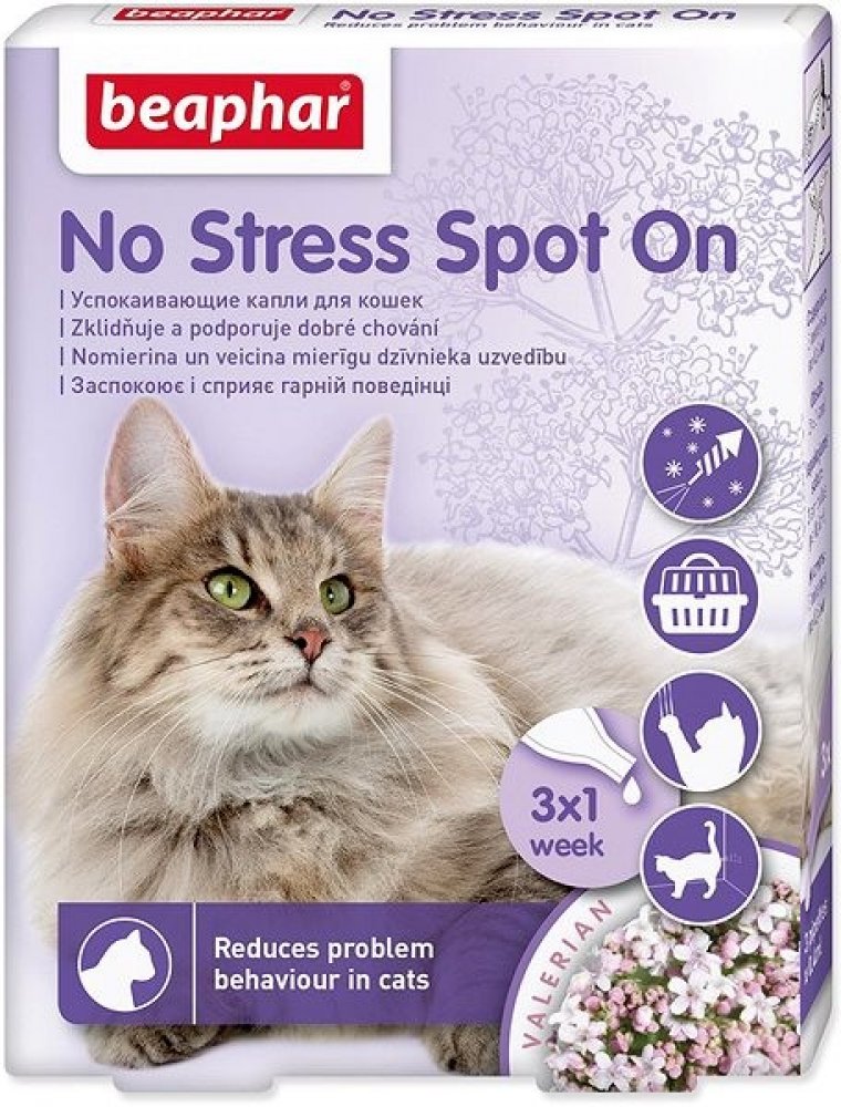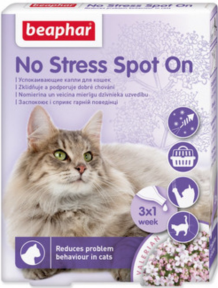 Beaphar No Stress Spot On je přípravek ve formě roztoku v pipetách, který snižuje stres u koček a udržuje je v klidu. Používá se při nadměrném mňoukání, úzkosti z odloučení, při návštěvě u veterináře, při cestování, při bouřce nebo ohňostroji, v případě destruktivního nebo nežádoucího územního chování. Obsahuje extrakt z kozlíku lékařského. Funguje na principu pomalého uvolňování a dlouhodobého úč...