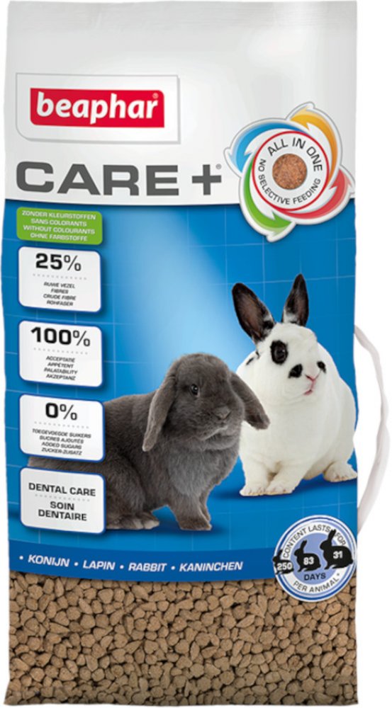 Beaphar Care+ – kompletní super prémiové granulované krmivo pro králíky. 5kg Granule Beaphar Care Plus jsou velmi chutné a vyvážené krmivo pro dospělé králíky, které byly vyrobeny ve spolupráci s veterináři, specialisty na výživu a chovateli. Speciální výrobní postup (extrudace) zaručuje, že jsou v krmivu obsažené bílkoviny upraveny pro snadné strávení. Tento způsob výroby navíc ničí všechny bakte...