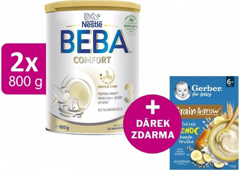 BEBA COMFORT 3 5 HMO 2 x 800 g + Gerber kaše banán a hruška 200 g