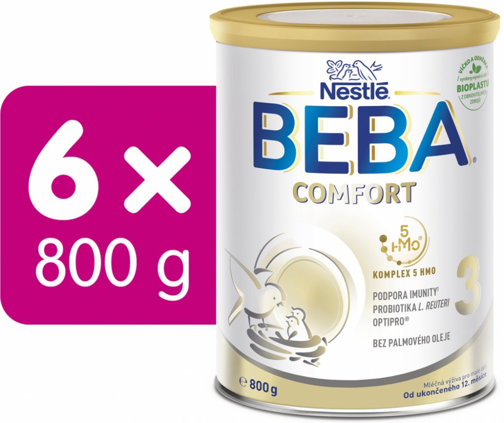 - Nestlé BEBA COMFORT 3, 5 HMO, mléčná výživa pro malé děti, s bakteriemi mléčného kvašení L. reuteri, obohacená vitamíny a minerálními látkami.