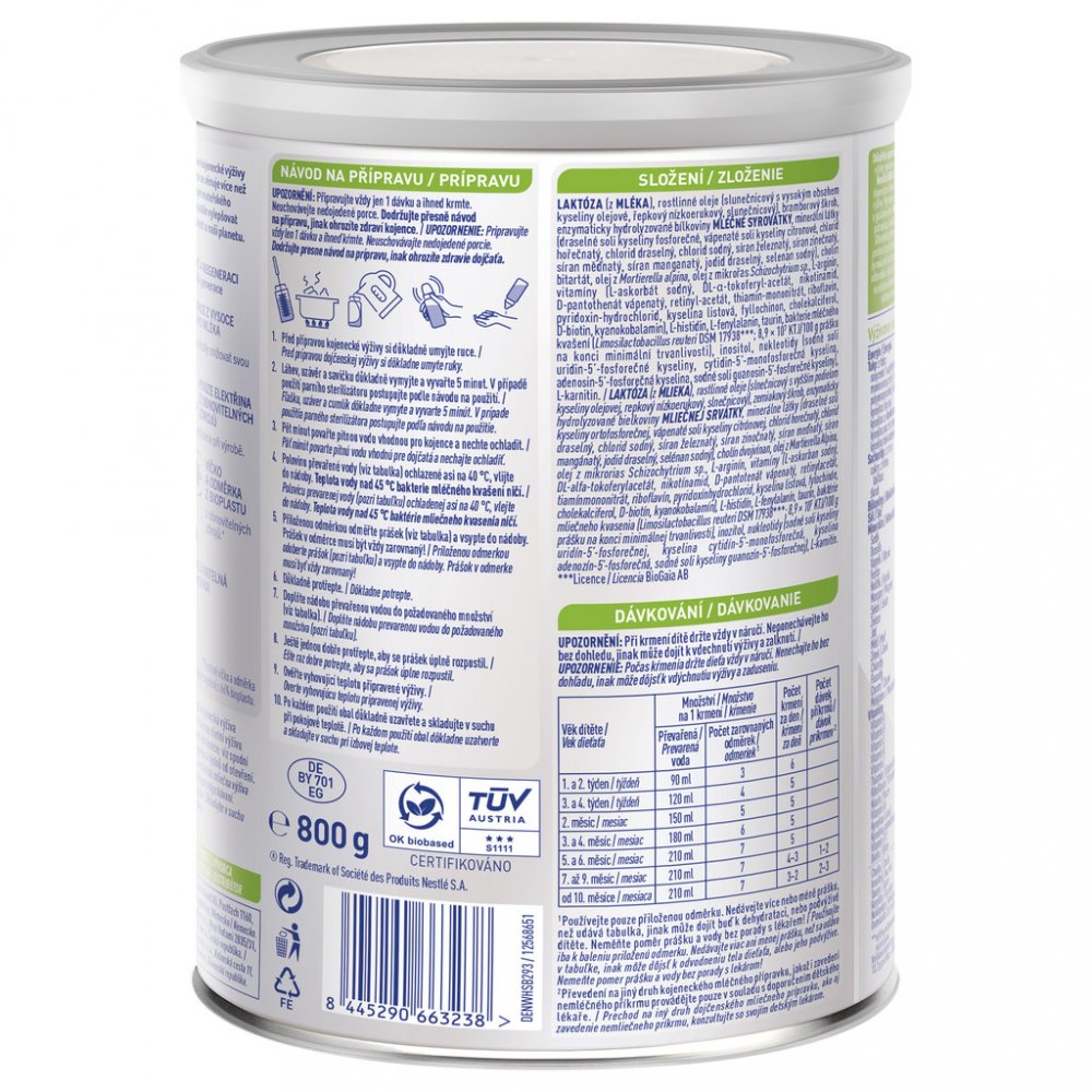 LAKTÓZA (z MLÉKA), rostlinné oleje (slunečnicový s vysokým obsahem kyseliny olejové, kokosový, řepkový nízkoerukový, slunečnicový), bramborový škrob 21,6 %, enzymaticky hydrolyzované bílkoviny MLÉČNÉ SYROVÁTKY 10,3 %, minerální látky (citronan draselný, glycerofosforečnan vápenatý, vápenaté soli kyseliny fosforečné, chlorid hořečnatý, chlorid vápenatý, chlorid sodný, síran železnatý, síran zinečnatý, síran měďnatý, síran manganatý, jodid draselný, selenan sodný), RYBÍ olej, cholin bitartát, olej z Mortierella alpina, L-arginin, vitamíny (L-askorbát sodný, DL-?-tokoferyl-acetát, nikotinamid, D-pantothenát vápenatý, retinyl-acetát, thiamin-mononitrát, riboflavin, pyridoxin-hydrochlorid, kyselina listová, fyllochinon, cholekalciferol, D-biotin, kyanokobalamin), L-histidin, L-thyrosin, bakterie mléčného kvašení (Lactobacillus reuteri DSM 17938; 8,9 x 107 KTJ / 100 g prášku na konci minimální trvanlivosti), taurin, inositol, nukleotidy (cytidin-5´-monofosforečná kyselina, sodné soli uridin-5´-fosforečné kyseliny, adenosin-5´- fosforečná kyselina, sodné soli guanosin-5´-fosforečné kyseliny), L-karnitin.