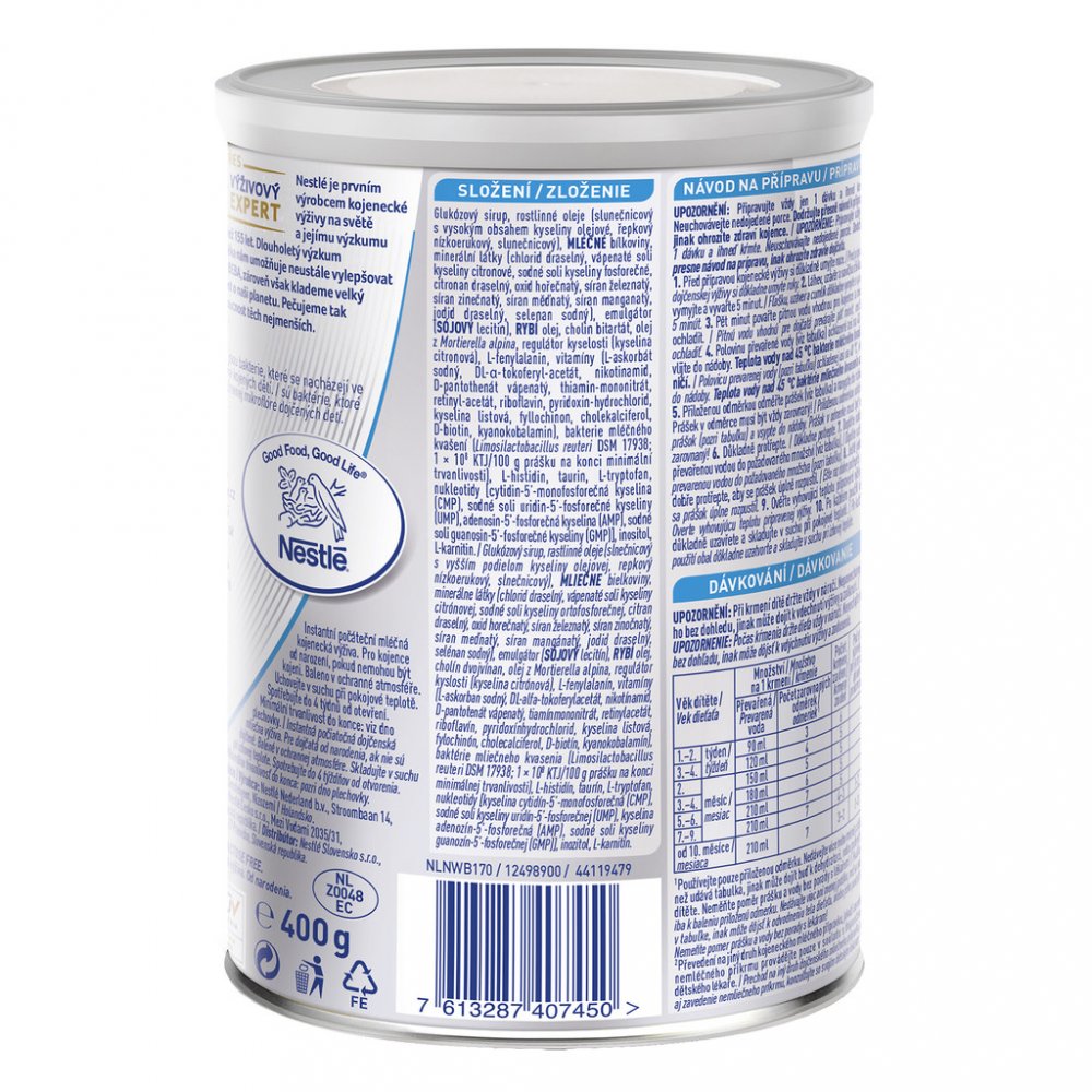 Důležitá upozornění: Pro výživu novorozenců a kojenců je nejpřirozenější a nejvýhodnější stravou zastoupením svých živin a jejich kvalitou mateřské mléko. Nestlé Beba AL 110 počáteční mléko by mělo být používáno pouze na základě doporučení lékaře nebo osoby kvalifikované v oblasti výživy lidí, farmacie nebo péče o matku a dítě. Výrobek je určený pro výživu kojenců od narození, nemohou-li být kojeni. Je vhodný pro výživu kojenců během prvních měsíců života až do doby zavedení vhodných příkrmů. Pro zdraví kojenců je důležité důsledné dodržování návodu na přípravu i uvedených doporučení.