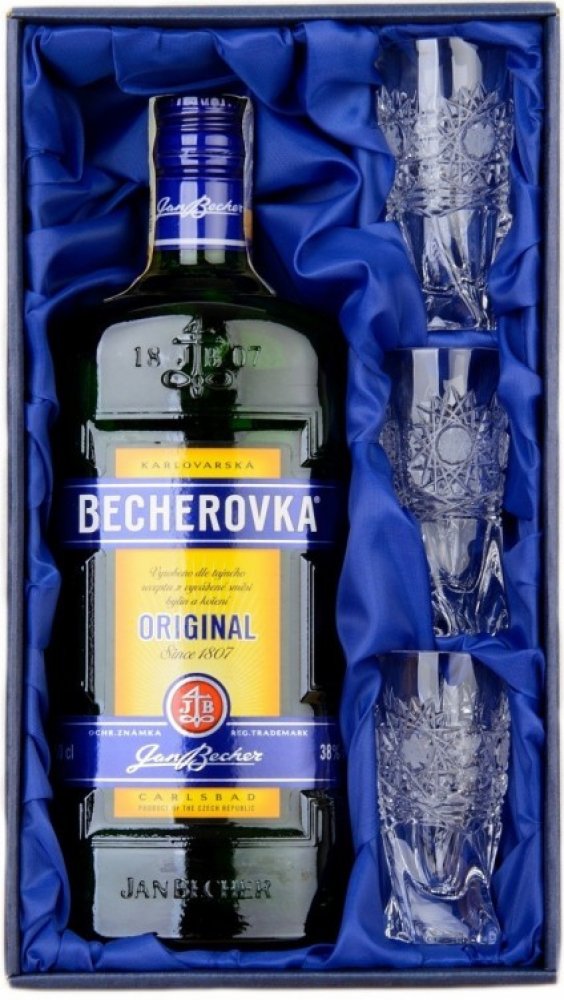 Dárkové balení Becherovky obsahuje nejen výtečný likér českého původu, ale i kvalitní malé panáky s objemem 50ml.