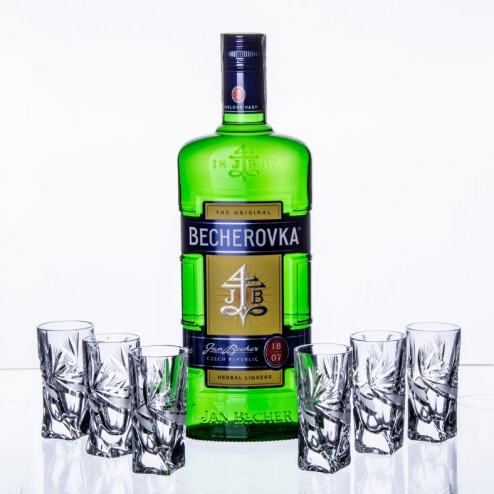 Becherovka set obsahuje láhev Becherovky s obsahem 0,7 l a 6 ks broušených skleniček na panáky ze suroviny Crystalite.