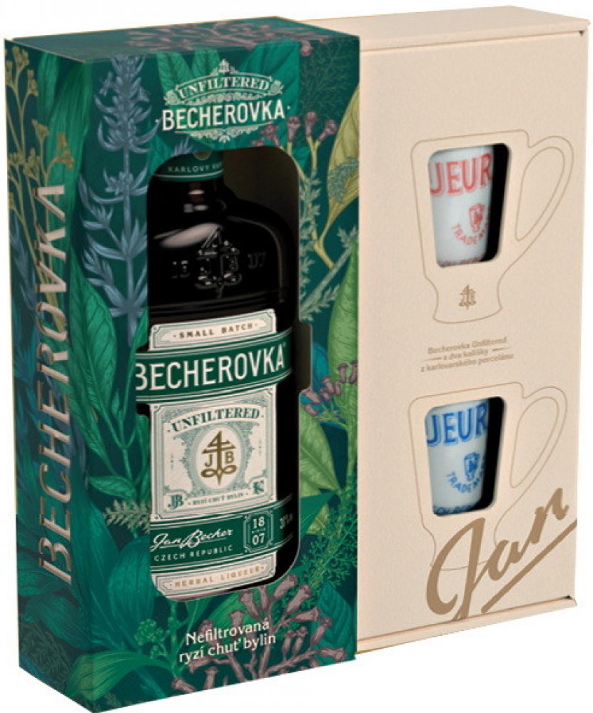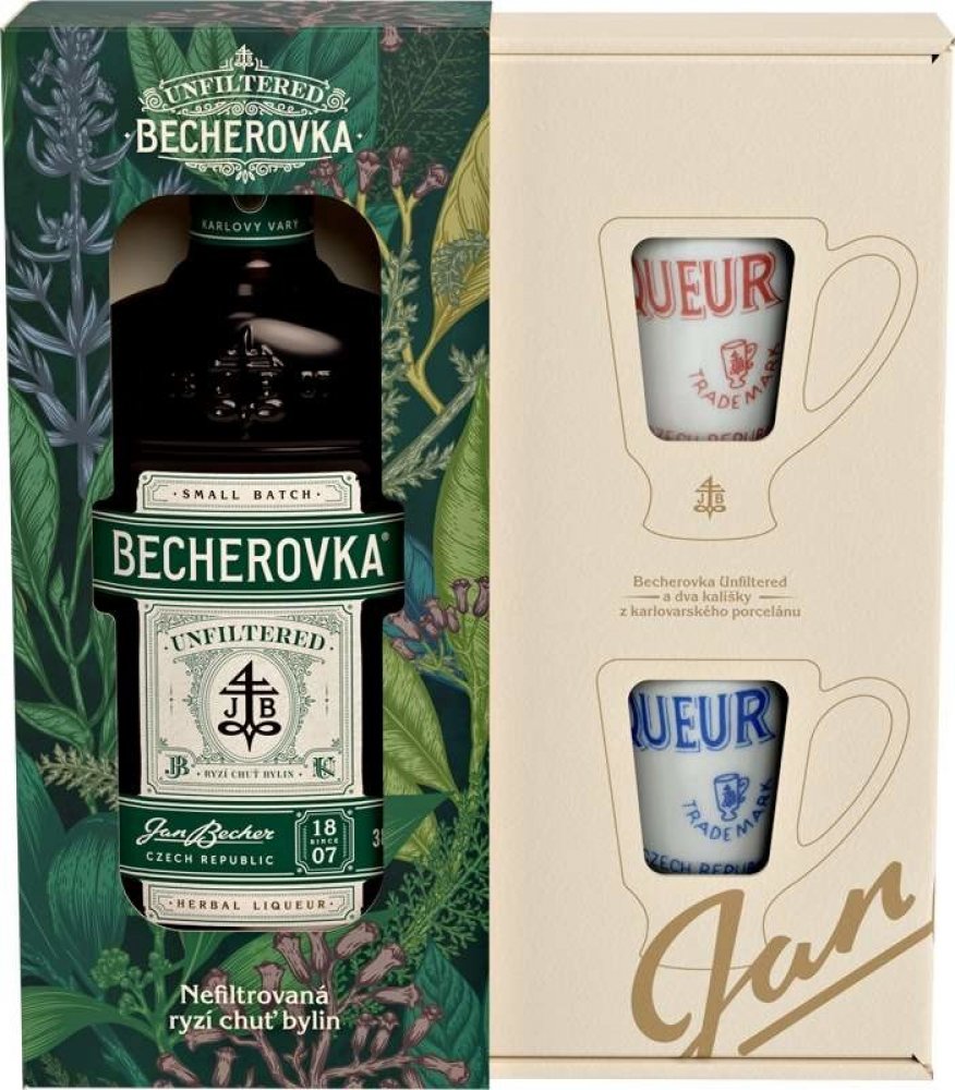 Dárkové balení Becherovky Unfiltered obsahuje 0,5litrovou láhev likéru a 2 elegantní kalíšky. Díky tomu je toto balení ideálním dárkem pro milovníky bylinných likérů, kteří si chtějí vychutnat Becherovku v její nefiltrované podobě.