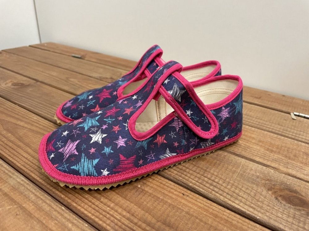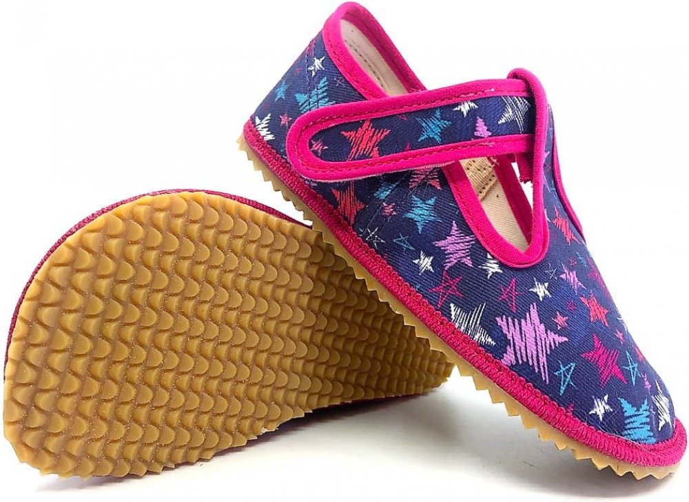 Dětské barefoot bačkory Beda Stars, v tmavě modré barvě s růžovým obšitím a dívčími motivy hvězdiček. Vyrobené v ČR.