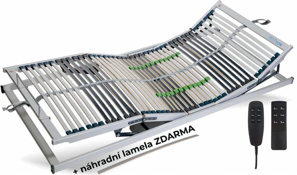 Speciálně nízký lamelový rošt SLIMTON 42 MOT je elektricky polohovatelným typem roštu do postele s možností komfortního podepření hlavy včetně horní části těla a podepření nohou. Polohování zajišťuje výkonný motor od výrobce Germany Motions. Napájení motoru probíhá pomocí 2,2 m dlouhého kabelu z elektrické zásuvky na 220V, ale mechanizmus motoru pracuje pouze s bezpečným stejnosměrným napětím 24V....