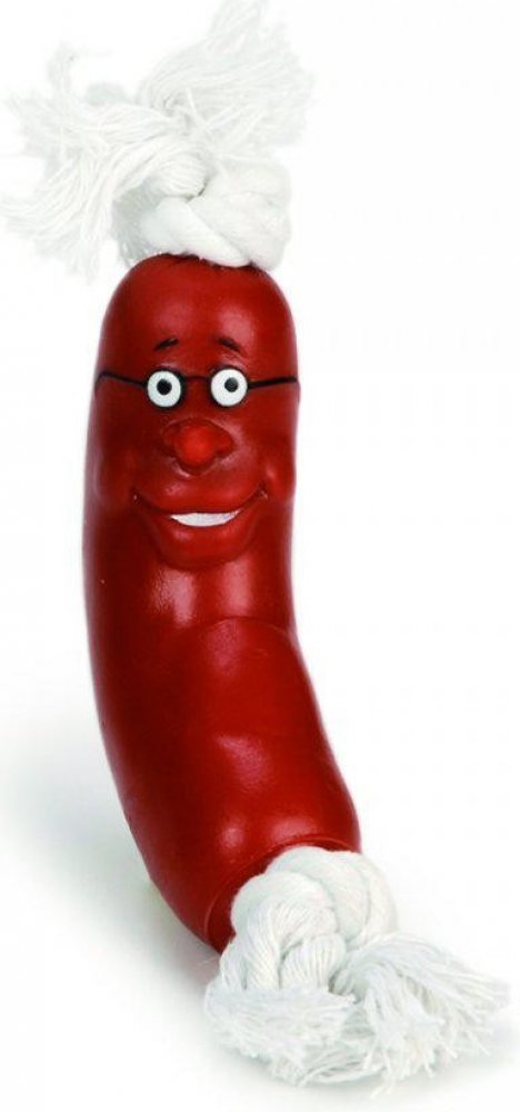 Miluje Váš pes klobásu? Pak si zamiluje hraní s touto klobásou s vtipným obličejem. Je vyrobena z vinylu, obsahuje zabudované pískátko a bavlněný provaz, které povzbudí Vašeho psa k další hře. Lano navíc přispívá hravou formou k péči o zuby.