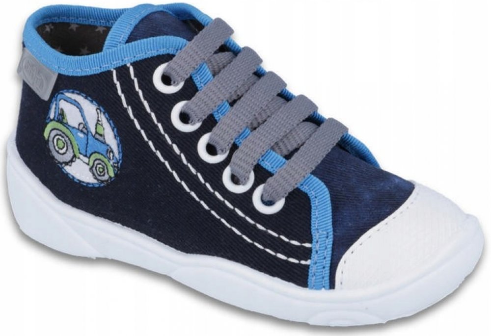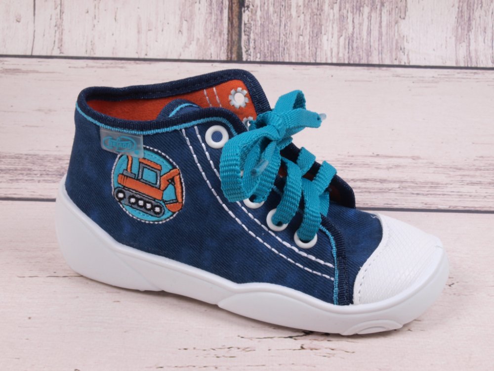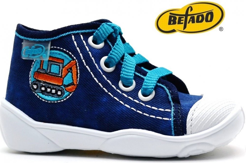 Chlapecké plátěné kotníčkové tenisky Befado Maxi zajistí pohodlí na každém kroku. Klasické šněrovací tenisky jsou ideální dětskou obuví pro sportovně-rekreační aktivity venku a v tělocvičně. Jsou vyrobené z vysoce kvalitních přírodních a prodyšných látek. Barva a design: modrá s výšivkou bagru. Vyztužená zadní část boty stabilizuje patu. Široké a vysoké špičky bot, jsou vhodné pro volný pohyb prst...