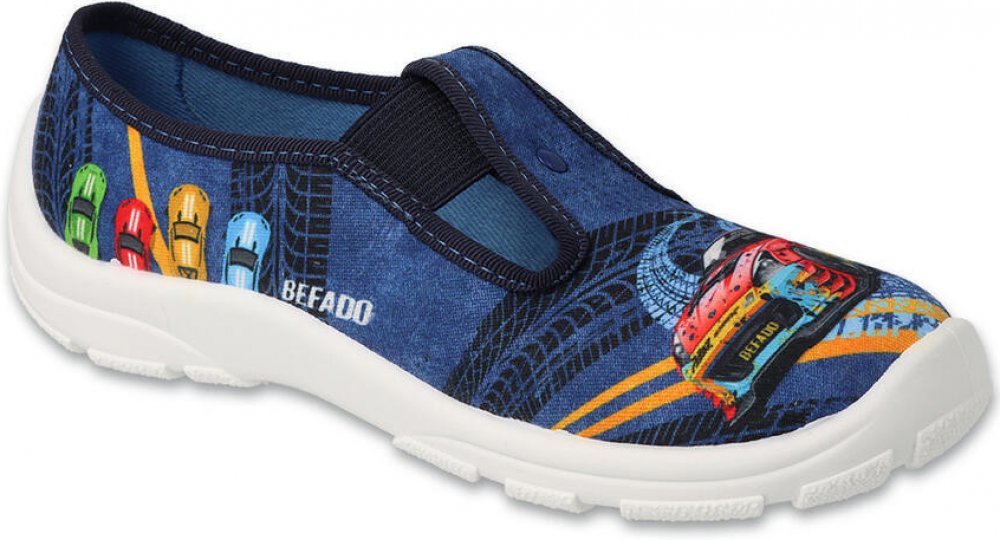 Chlapecké bačkory Befado auta. Pevná pata a pružná a prodyšná podrážka, SOFT-B systém - systém ochrany chodidel - vyměkčená stélka, poskytující zvýšené pohodlí při chůzi.