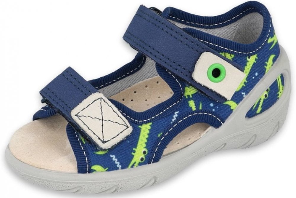 Plátěné chlapecké sandály Sunny s motivem krokodýlů od značky Befado s pásky na suchý zip. Sandály mají široké a vysoké špičky pro volný pohyb prstů.