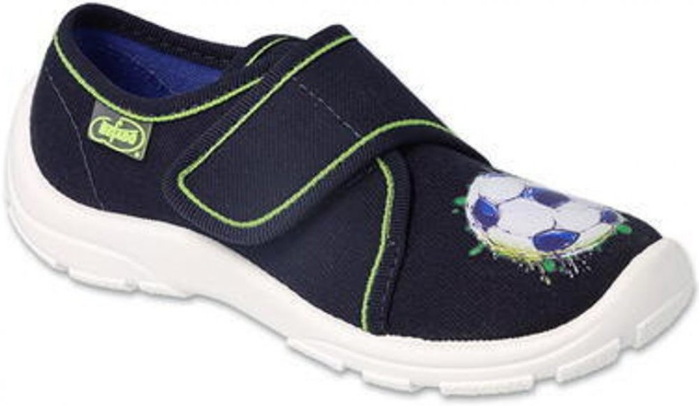 Domácí obuv na suchý zip v modré barvě s fotbalovým míčem.