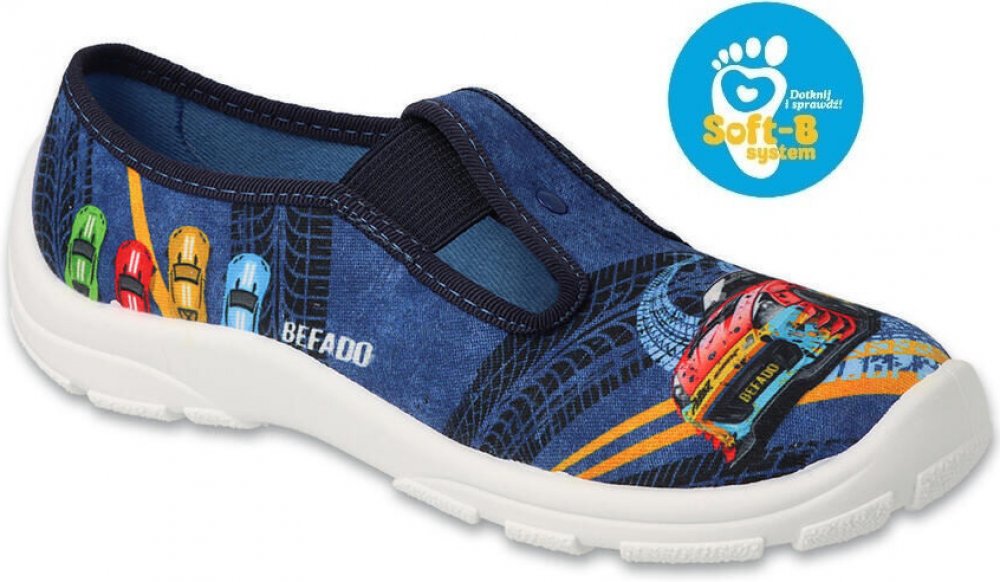 Oblíbené nazouvací obrázkové dětské bačkory bez zapínání od výrobce Befado. Dětská textilní obuv s gumičkou, vzorem aut a pneumatických stop na modrém podkladu, bílá podrážka. vyměkčená vnitřní stélka systémem soft-b systém bačkory jsou vyrobeny z kvalitních prodyšných materiálů na pružné protiskluzové podešvi v podešvi patentovaný absorb system, který zajišťuje měkčí došlap perforace (děrování) p...