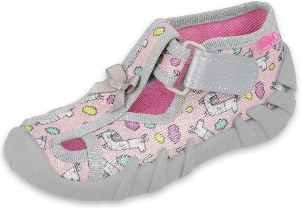 Vyšší dívčí bačkůrky Speedy 190P099 od značky Befado ve třpytivém provedení s motivem lam. Přezůvky odpovídají veškerým nárokům kladeným na zdravé a pohodlné obutí doma i ve školce.