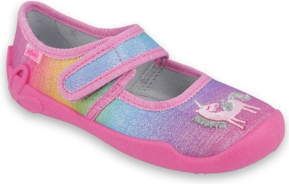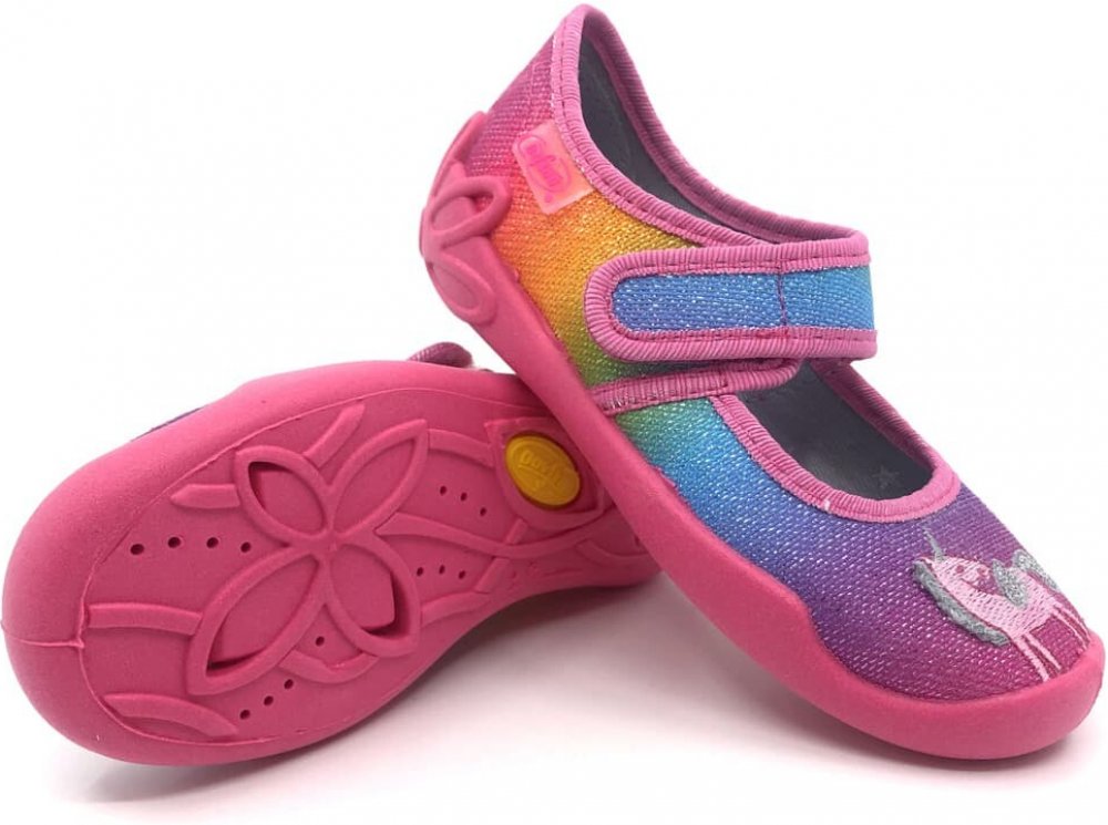 Dívčí bačkory Befado Unicorn 123x048 v duhovém zpracování s nášivkou jednorožce. Bačkory jsou velmi ohebné všemi směry, mají zpevněný opatek a nevyjímatelnou vnitřní stélku s měkkou nášlapnou výplní. Podrážka je měkká a ohebná všemi směry. Má ventilační otvory pro lepší komfort a prodyšnost, zároveň nezanechává šmouhy na podlaze. Jsou tedy vhodné do školy i školky. V přední i zadní části je podráž...