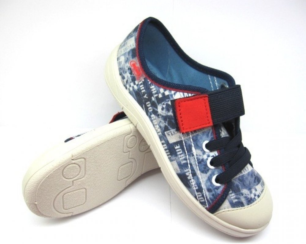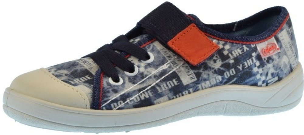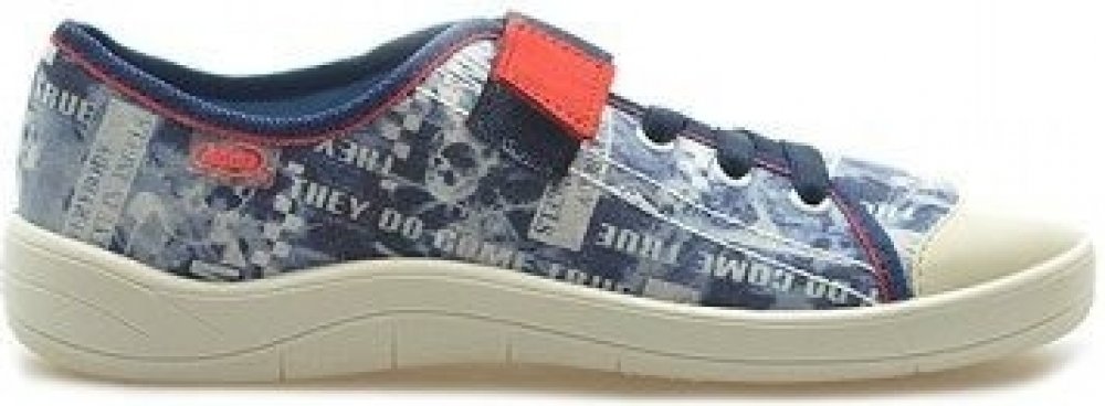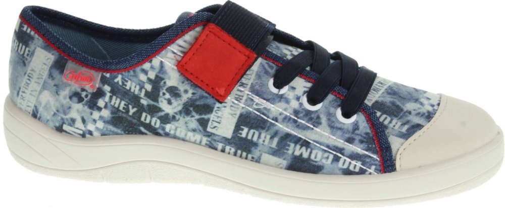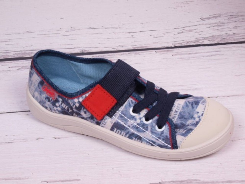Chlapecké nízké tenisky Befado jsou v modré barvě. Obuv je zdobena potiskem. Tenisky jsou na zalepování. Tkaničky mají designový charakter.