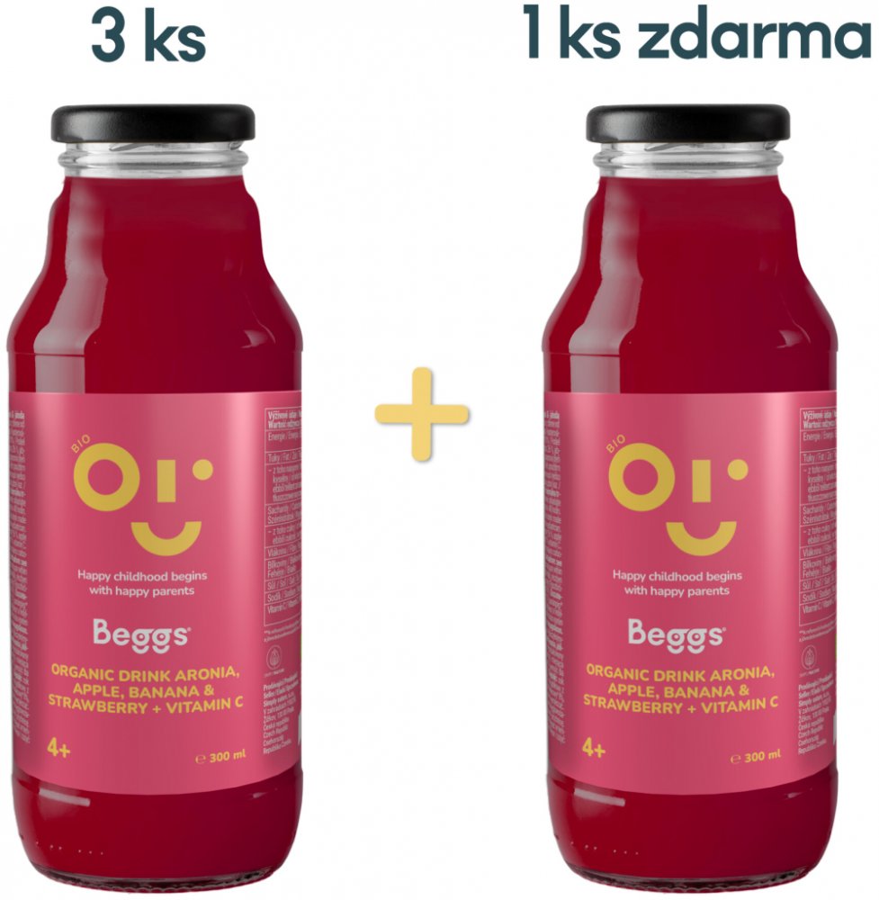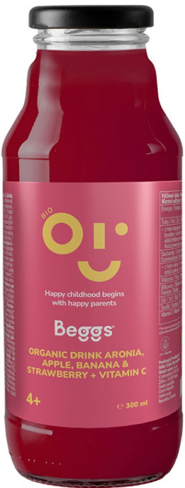 Nápoj Beggs BIO aronie, jablko, banán & jahoda300 ml Nápoj Beggs BIO je ovocný nápoj vyrobený z části z koncentrátu a dřeně aronie, jablka, banánu a jahod. Nápoj je možné podávat už při zavádění prvních příkrmů. Ovocný nápoj obohatí pitný režim miminka. Můžete ho podávat přímo nebo ředěný kojeneckou vodou. Podíl ovocné složky je 100 %. Nápoj je v BIO kvalitě a obsahuje přirozeně se vyskytující cuk...