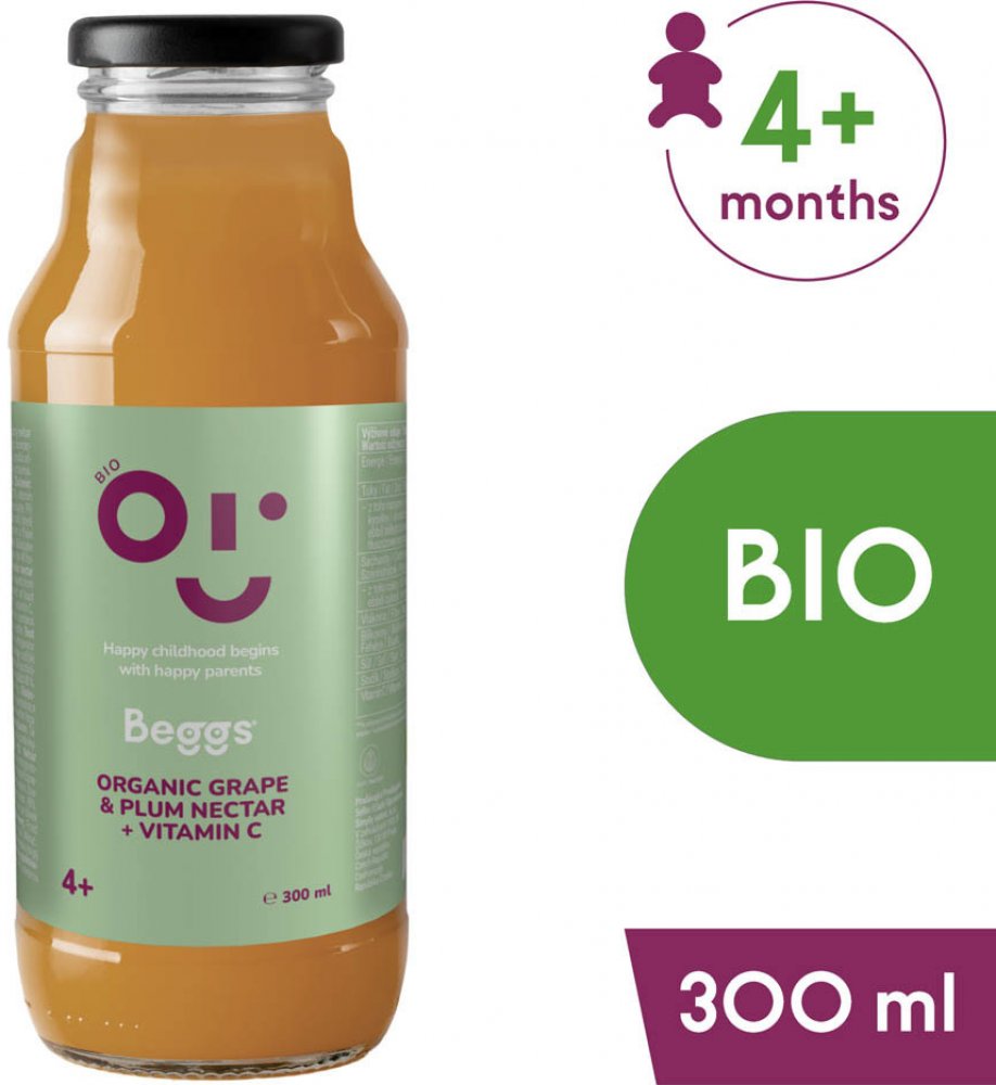 Nápoj Beggs BIO nektar hroznové víno & švestka300 ml Nápoj Beggs BIO je ovocný nápoj vyrobený z hroznové šťávy z koncentrátu a švestkového pyré. Nápoj je možné podávat už při zavádění prvních příkrmů. Ovocný nápoj obohatí pitný režim miminka. Můžete ho podávat přímo nebo ředěný kojeneckou vodou. Podíl ovocné složky je nejméně 88 %. Nápoj je v BIO kvalitě a obsahuje přirozeně se vyskytující cukry. ...