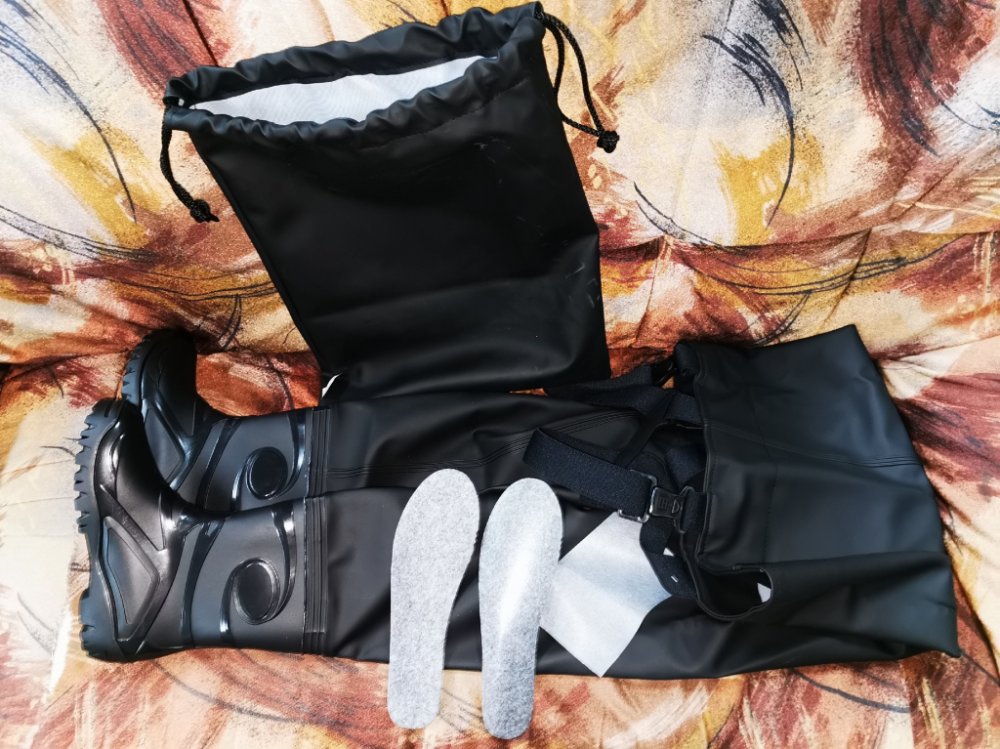Velikost 38 mají výšku od paty spodní části boty po rozkrok cca 77 cm. Prsačky jsou v černé barvě s originální černou taškou z pvc. Jedná se o černou barvu. V prsačkách je navíc v každé botě vložka.