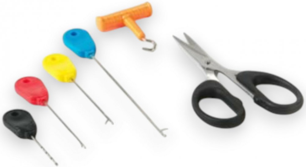 Šestidílná sada bižuterie skládající se z jehel, vrtáčku, nůžek a utahovače. 2 x jehla se západkou 6 cm (silnější na boilies a jemnější na olověnku)