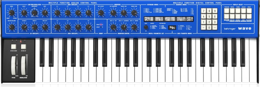 Behringer WAVE – Legendární 8hlasý hybridní multitimbrální syntezátor s generátorem wavetable, analogovými filtry VCF a VCA, LFO, 3 obálkami, arpeggiátorem a duálním sekvencerem.