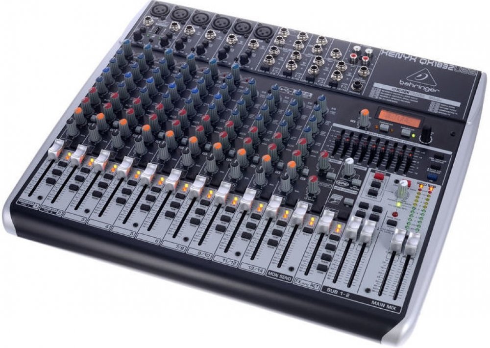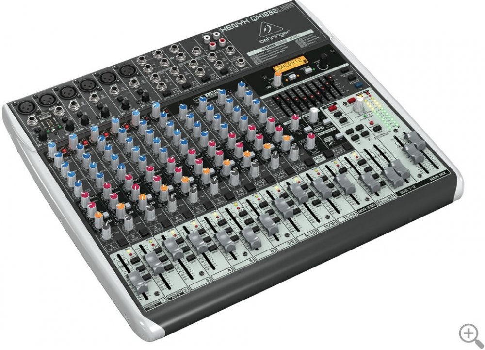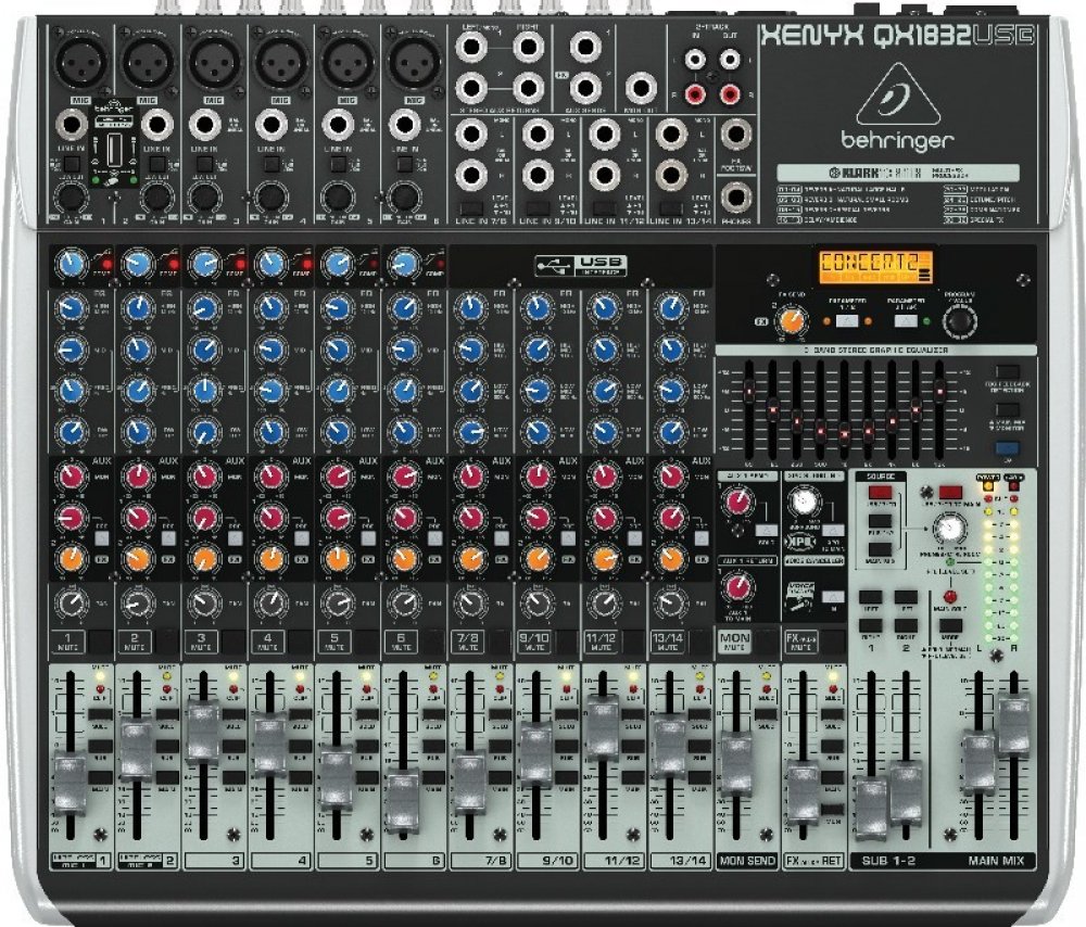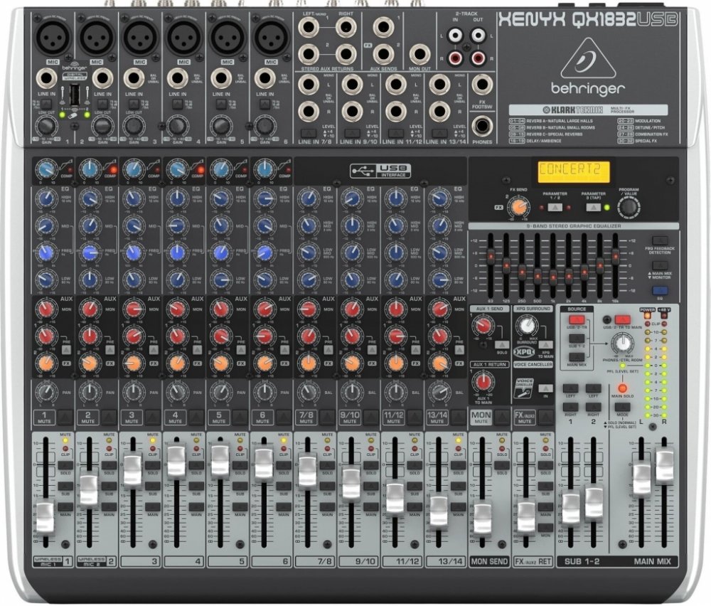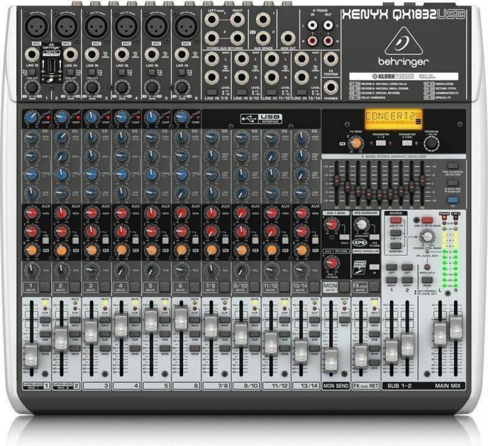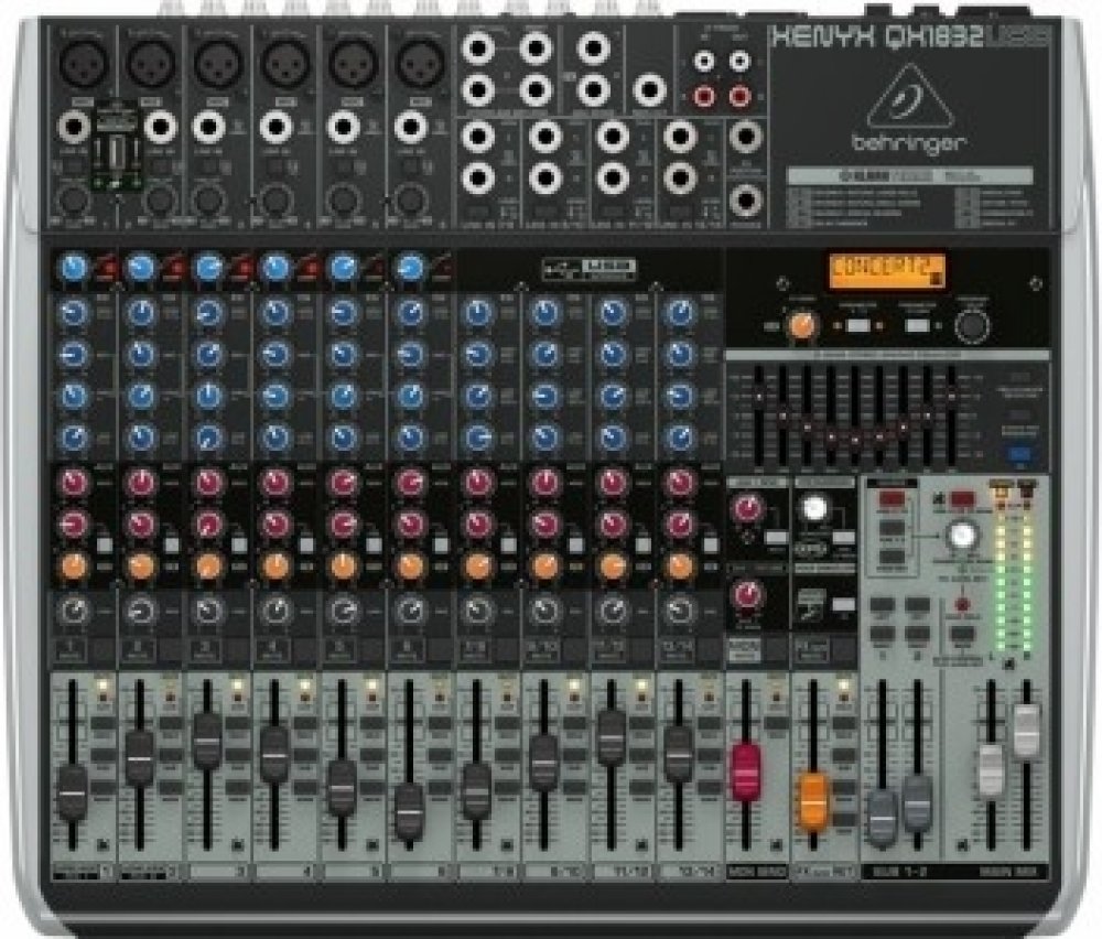 Behringer XENYX QX1832USB je profesionální mixážní pult. 6 mono vstupy - 3-pásmový EQ typu "British" - každý mikrofonní vstup je vybavený „jednoknoflíkovým“ kompresorem, 4 stereo vstupy s EQ, efektový procesor KLARK TEKNIK s 32 efekty (možnost nastavení parametrů), příprava pro až dvě bezdrátové sady (ULM200USB), fantomové napájení s nezávislým spínačem, AUX + FX AUX, 6x insert, na výstupu 7-pásmo...