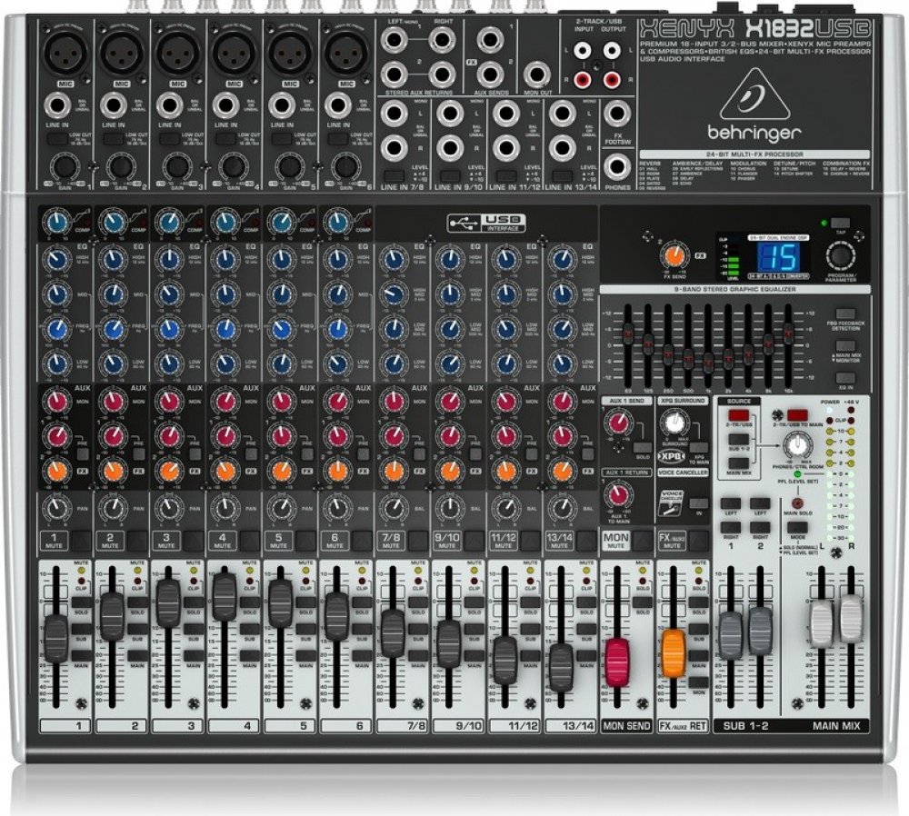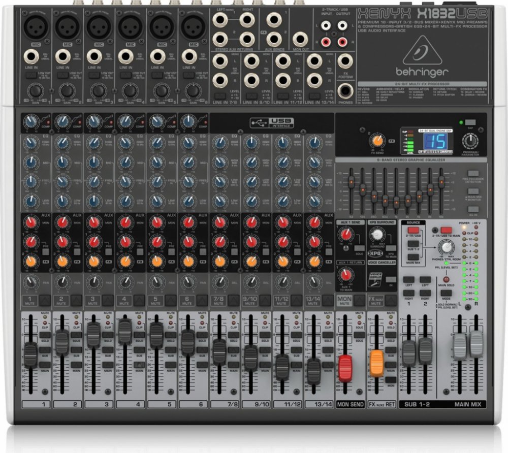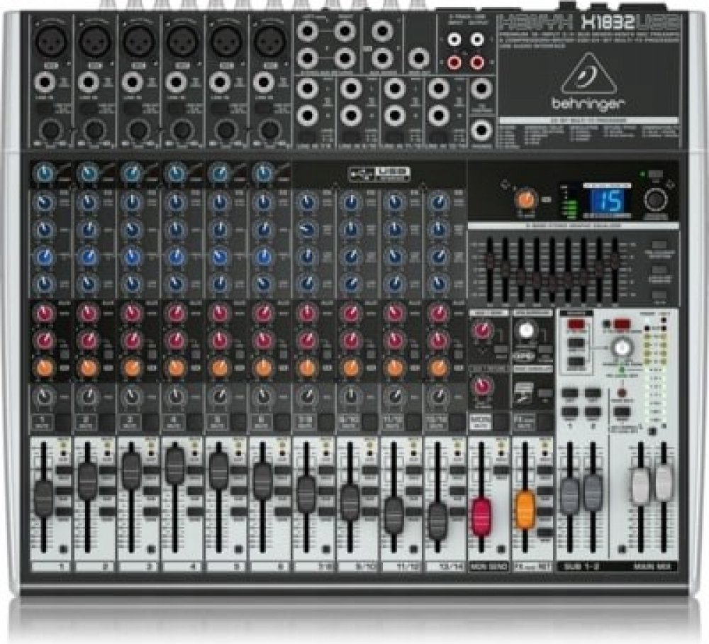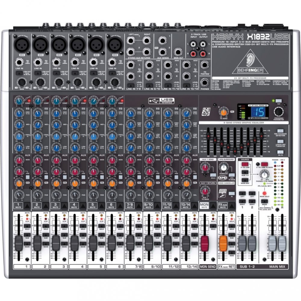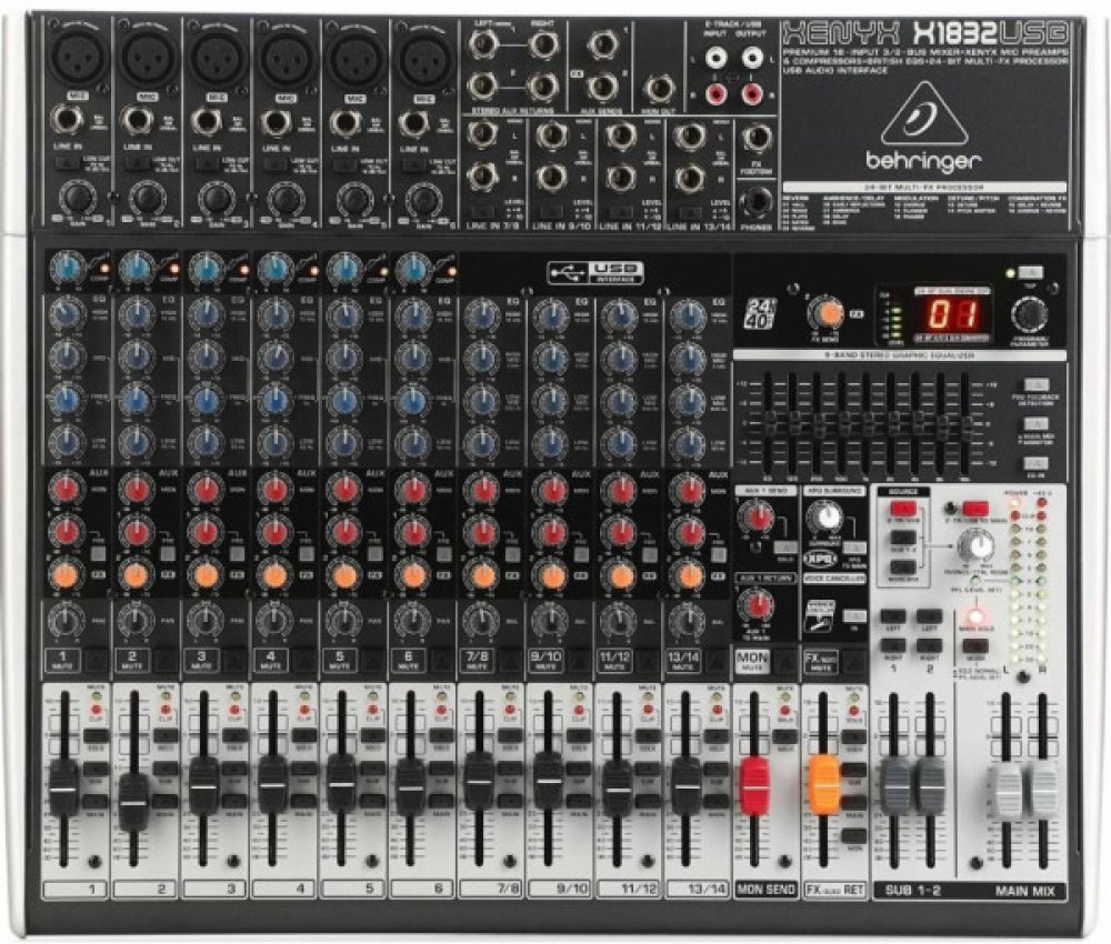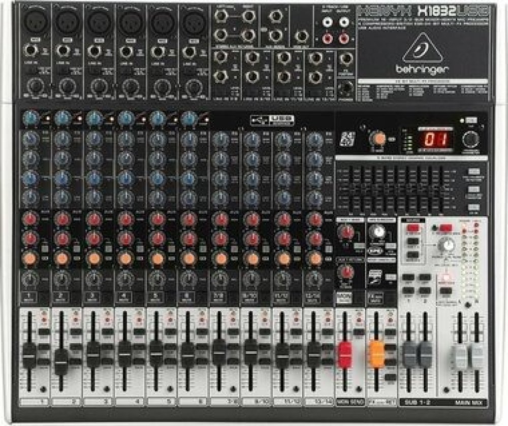 Mixpult, analógovy: 6 mono vstupy 3-pásm. EQ, param. stredy + low cut filter, 4 stereo vstupy 4-pásm. EQ, 2 stereo výstupy, 6 x insert, 1 x AUX přepínatelný PRE/POST. Premium 18-vstupý 3 / 2 Bus mixpult s XENYX mikrofonními předzesilovači, British equalizéry, 24-bit multi-FX procesor, USB / Audio interface a kompaktní energyXT2.5 BEHRINGER edice hudebně-produkčního softwaru.