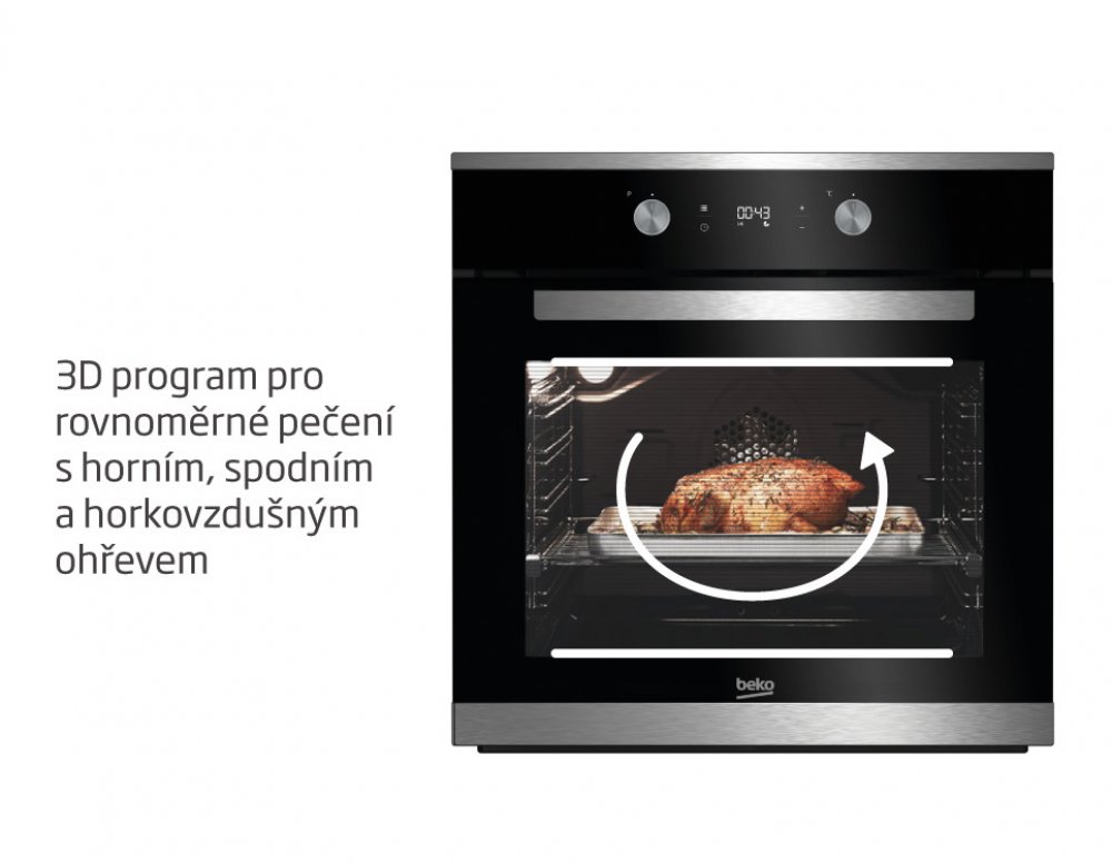 - Program 3D pečení kombinuje horní a spodní ohřev se zadním ohřevem z kruhového topného tělesa a s ventilátorem. Teplo tak jde ze všech tří stran trouby, takže se jídlo propeče rychleji a rovnoměrně.